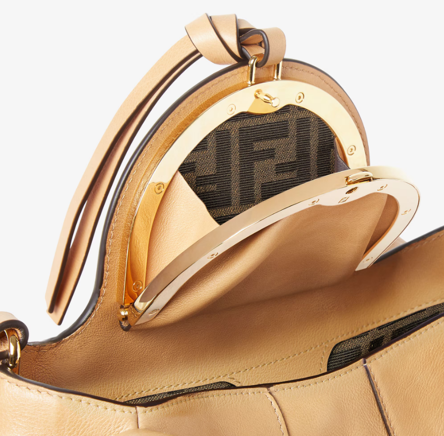 -Material and texture: The bag is made of high-quality, soft beige leather, which has a delicate and glossy surface and a soft, smooth texture, giving it a luxurious and sophisticated feel.