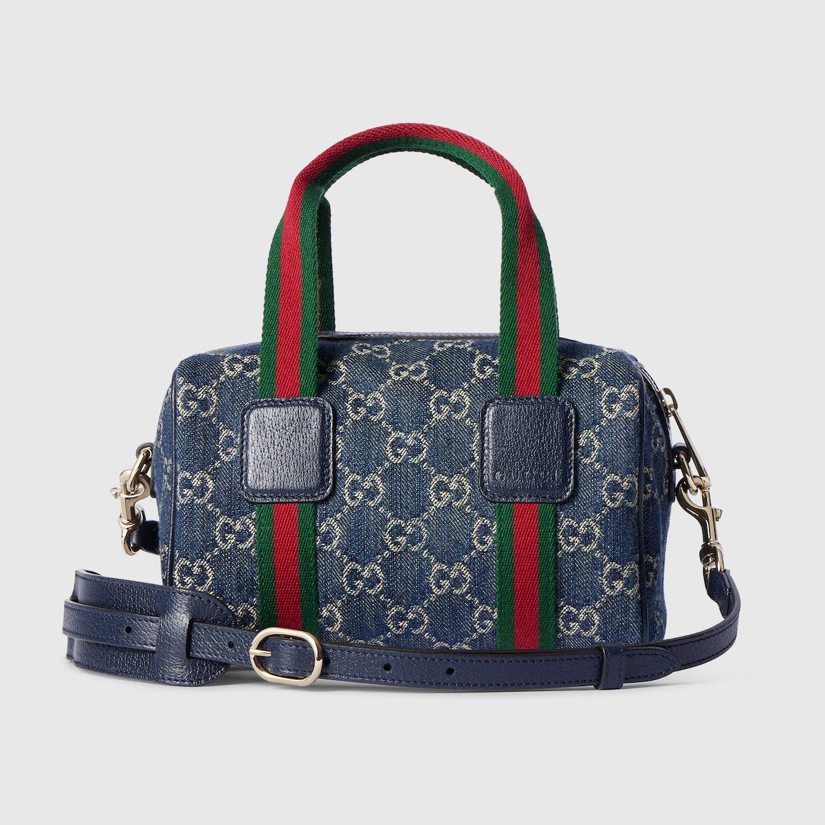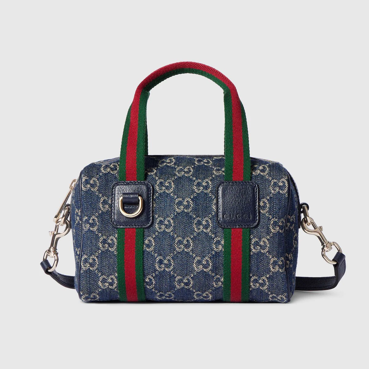 -Material and texture: The bag is made of denim fabric with a subtle texture, and features an all-over print of the iconic Gucci double G logo, seamlessly blending a vintage denim style with the brand’s signature design elements.