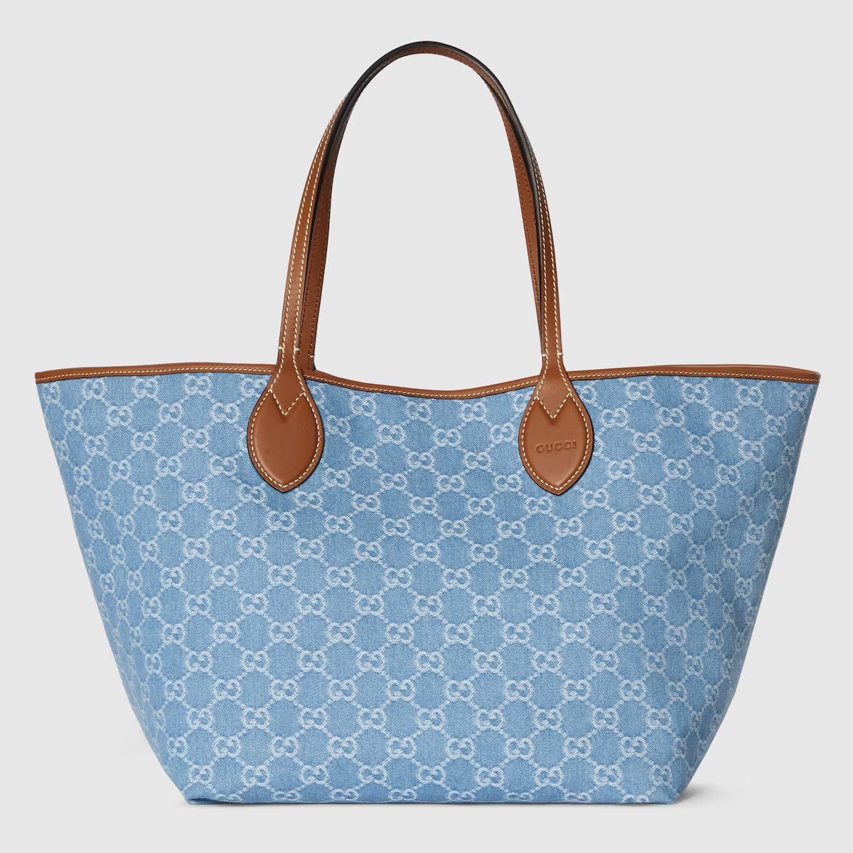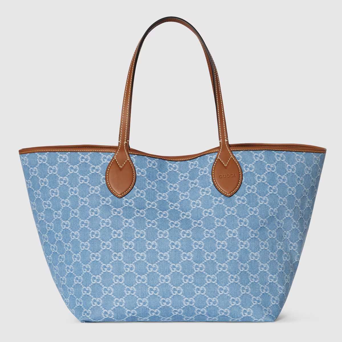 -Material and Printing: The bag is made of light blue denim and printed with the classic white Gucci double G logo, which is retro and recognizable.