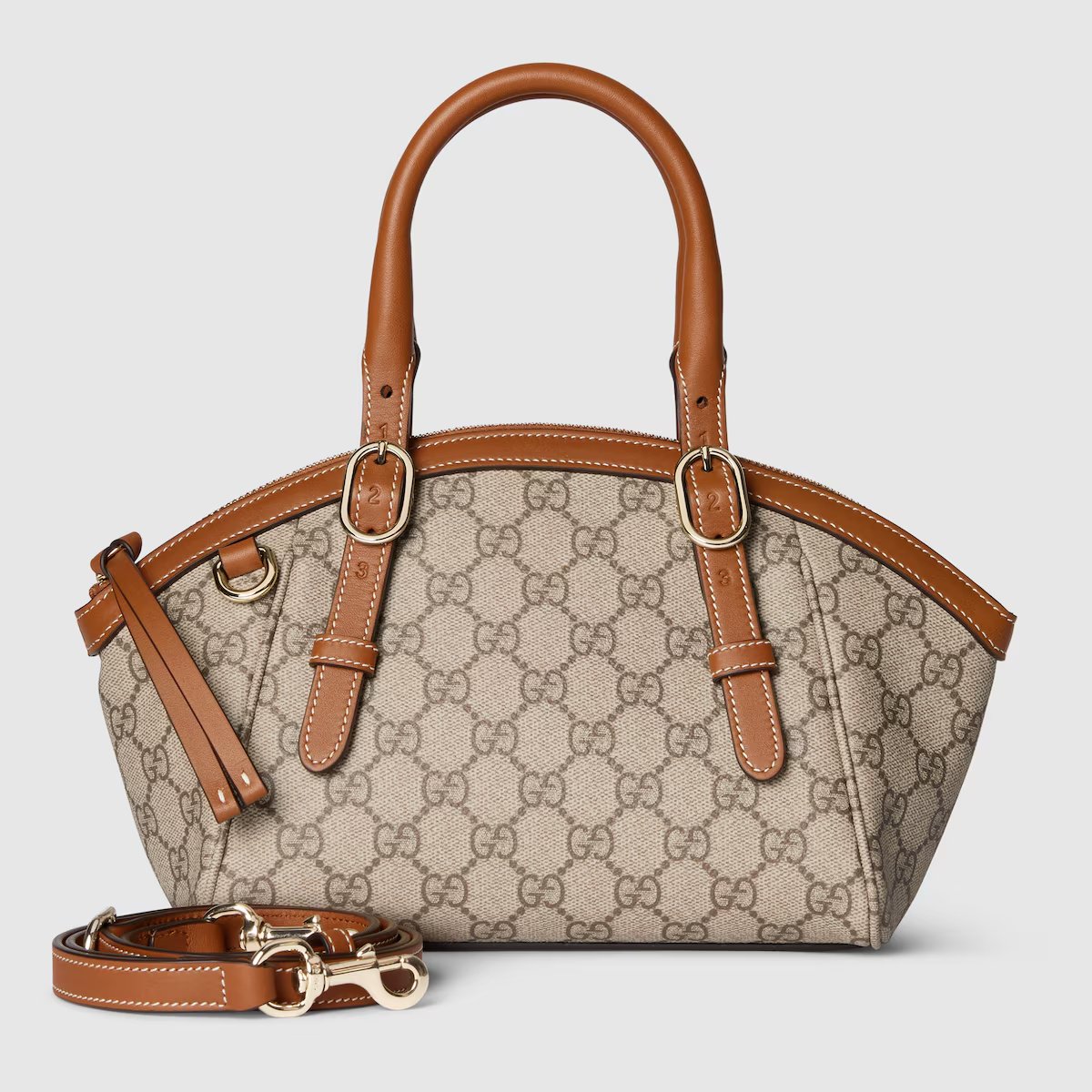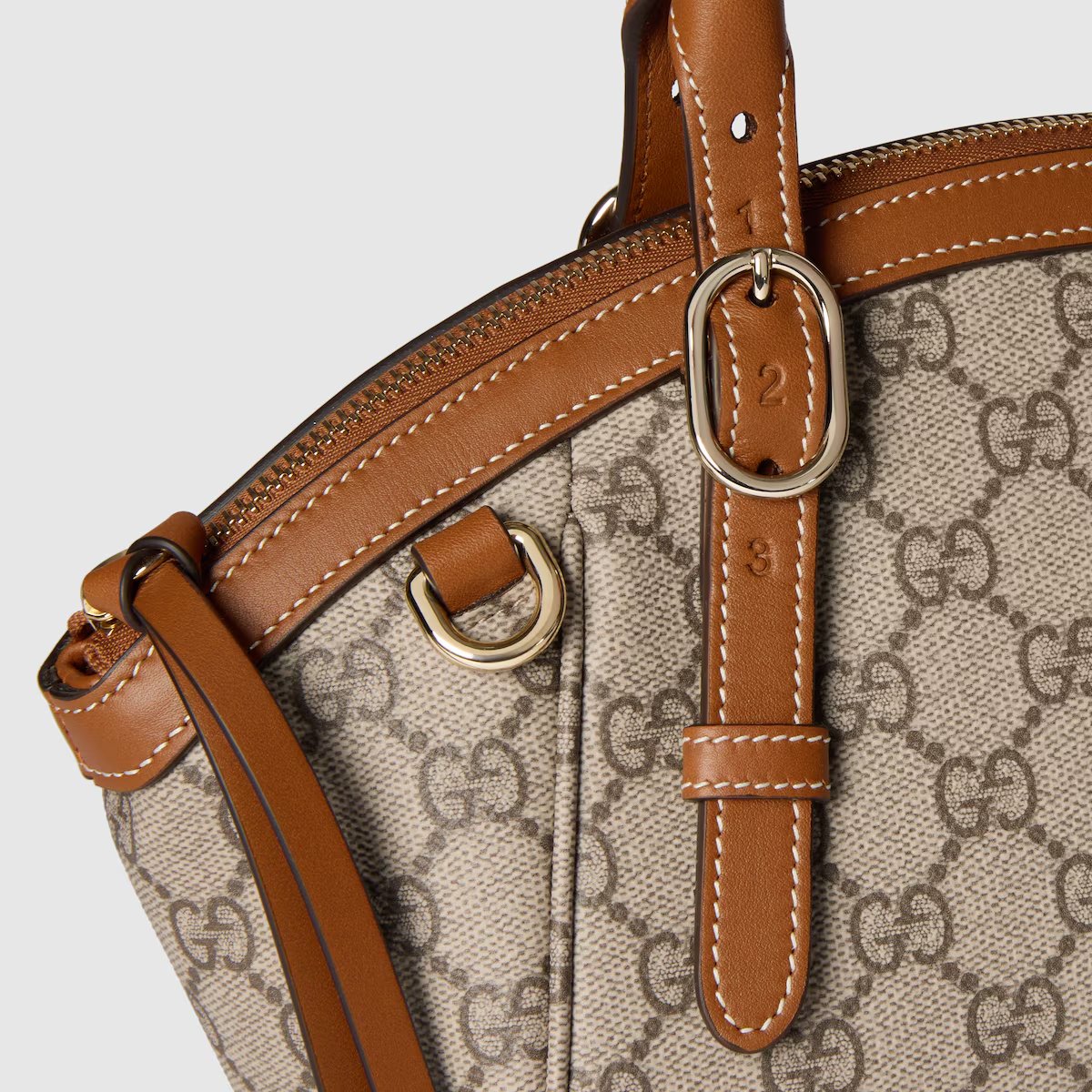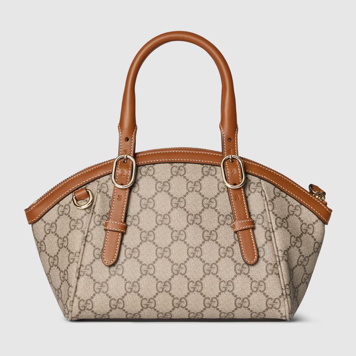 -Classic logo: The bag is made of Gucci’s iconic GG canvas, with a light beige background and a dark brown GG pattern, showing the brand’s classic retro texture.