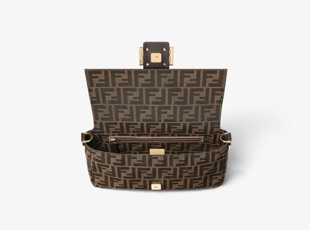 -The iconic design features: The bag is adorned with Fendi’s signature FF monogram pattern, featuring a blend of dark brown and black-brown tones. The vintage-style texture and the embossed jacquard weave create a highly recognizable and sophisticated look.