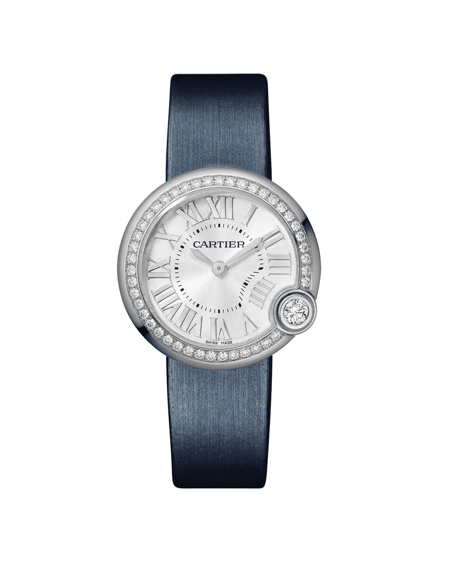 Ballon Blanc de Cartier watch. 30 mm. quartz movement. Steel case with one diamond at 4 o’clock and set with 44 brilliant-cut diamonds. totaling 0.66 carat. Silver dial with sunray-effect. Sword-shaped hands. Sapphire crystal. Calfskin strap. steel ardillon buckle. Case thickness: 8.40 mm. Water-resistant up to 3 bar (approx. 30 meters/100 feet).