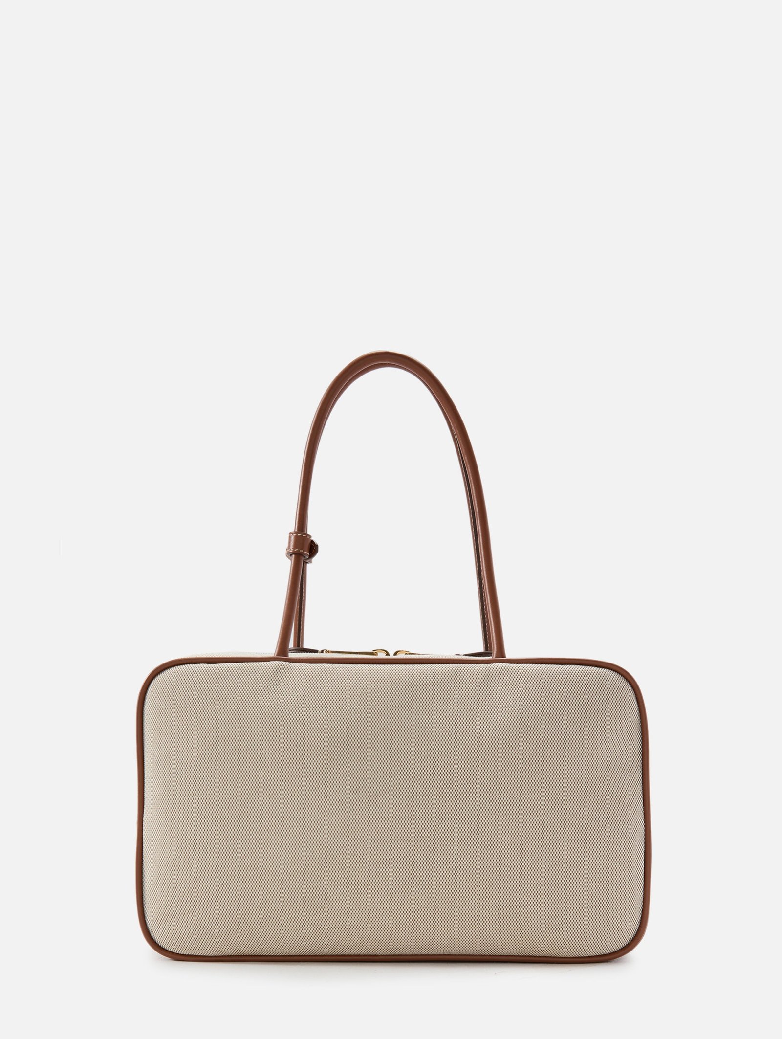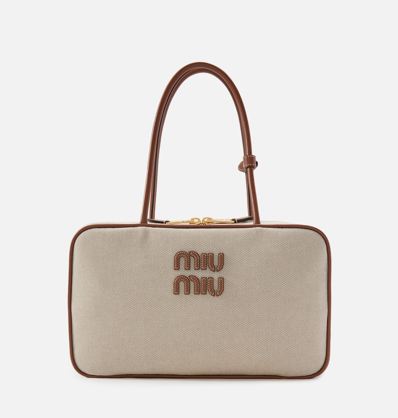 Miu Miu’s embossed logo stands out from the softly structured design of this canvas bag?? accented with leather trims and handles.