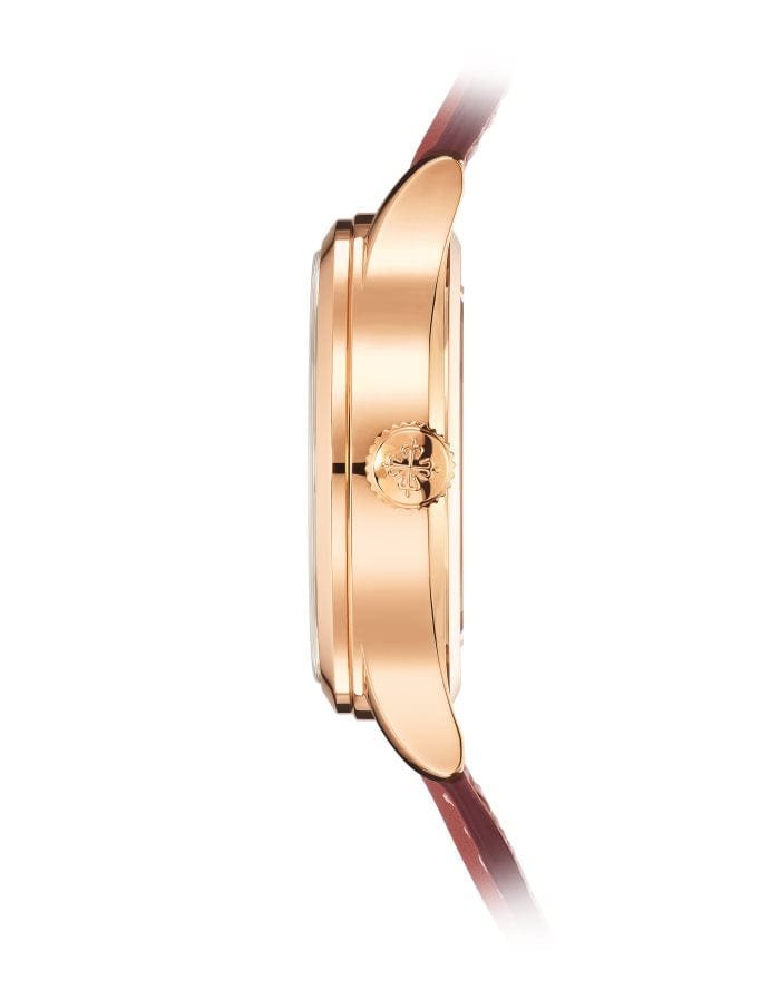 18k rose gold 37.5mm calatrava pilot travel time self-winding. brown sunburst/black gradated dial. arabic numeral index. sub dial. sec. round polishded bezel on vintage brown calfskin leather strap with clevis prong tang buckle