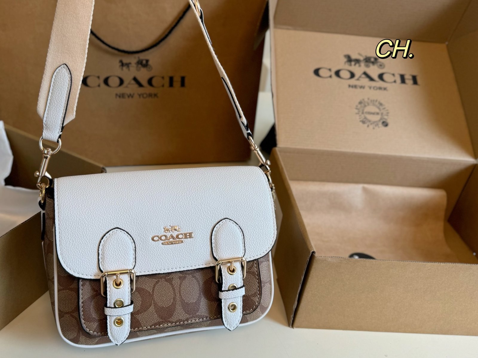 ‘-Brand and Material Design: This COACH bag features a combination of white leather and the brand’s signature light brown monogram canvas, creating a retro yet refined look.