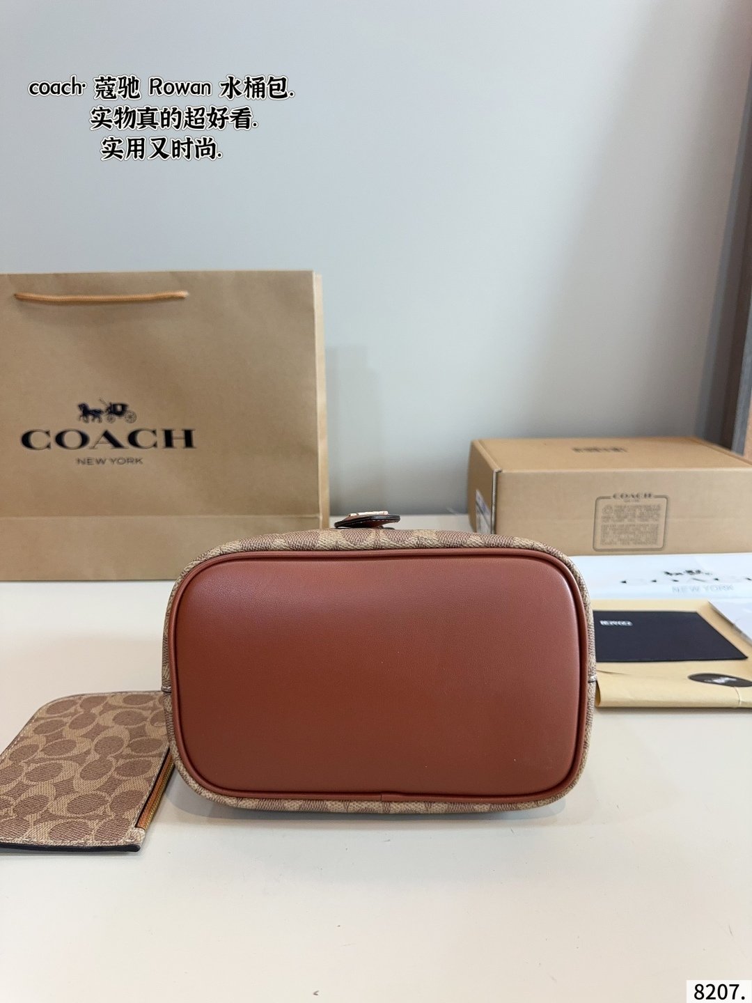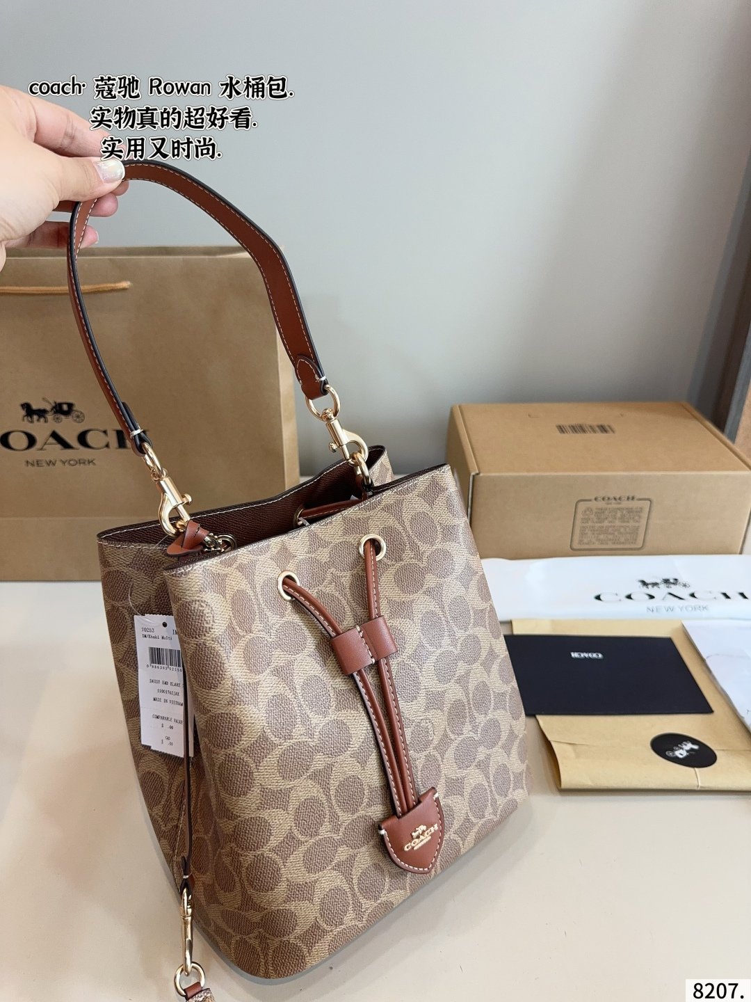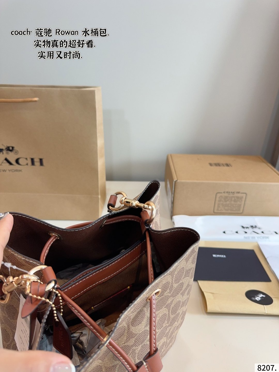 ‘-Brand and Series: This COACH Rowan bag is a bucket bag designed to combine practicality and style.
