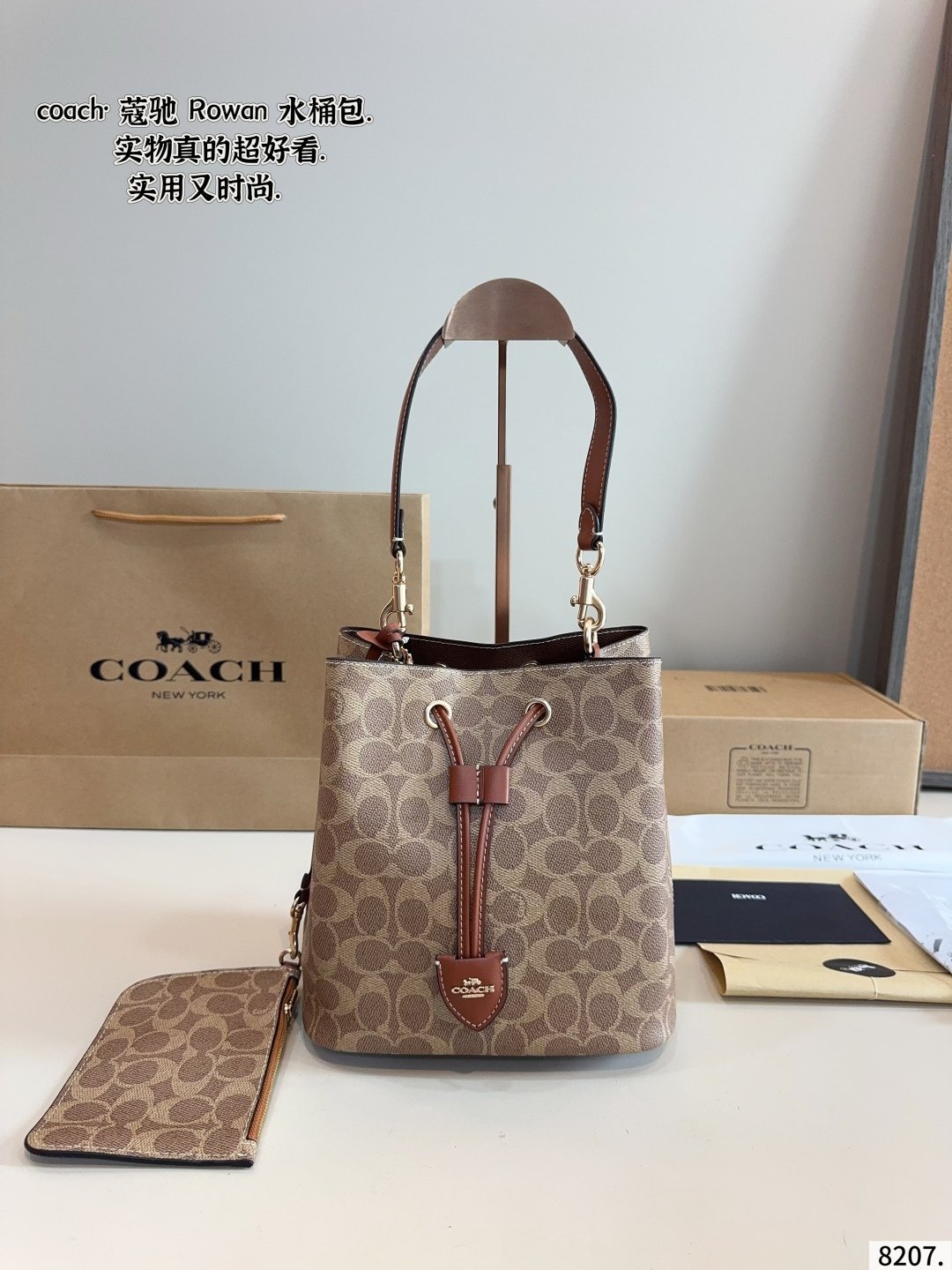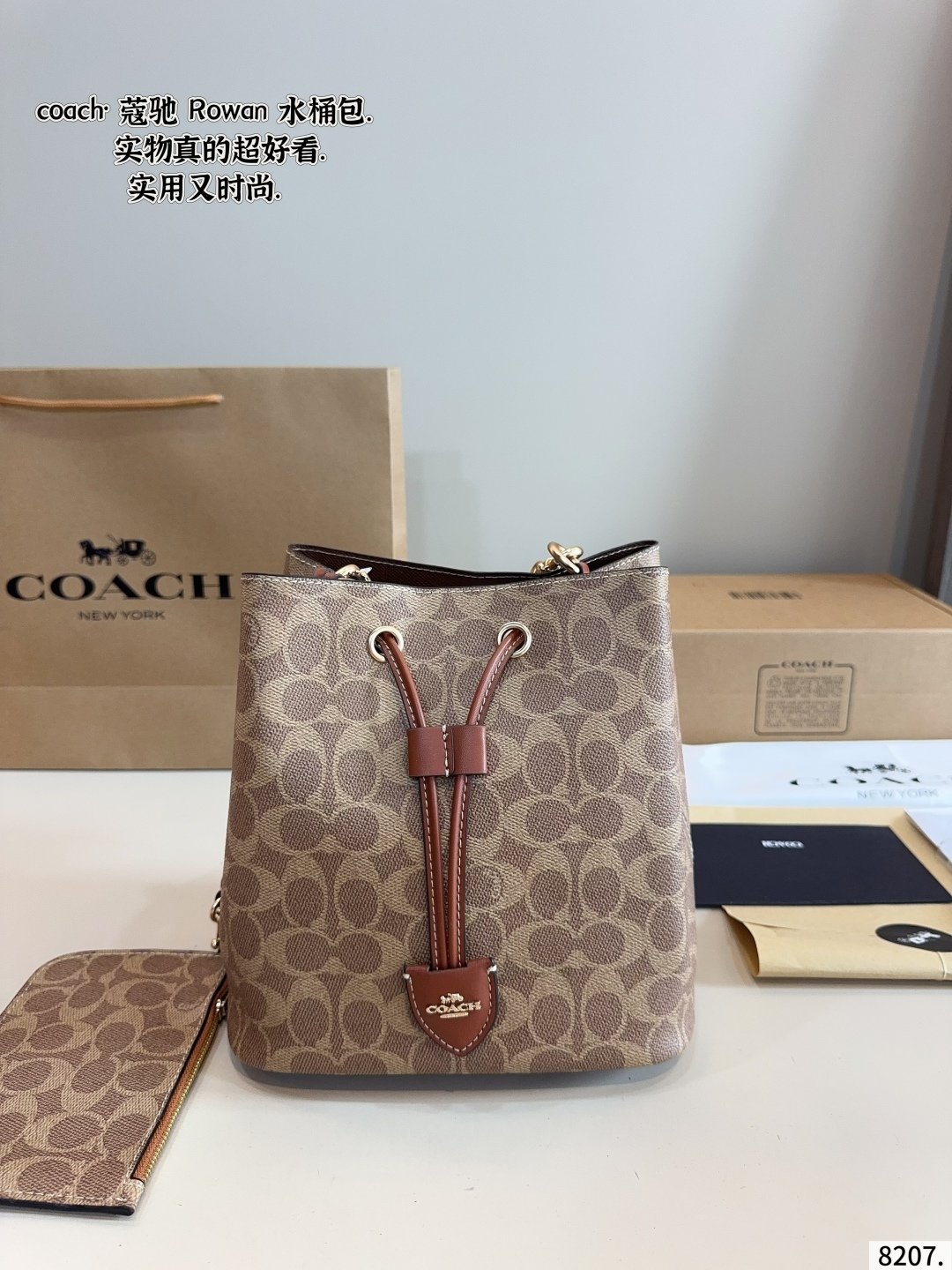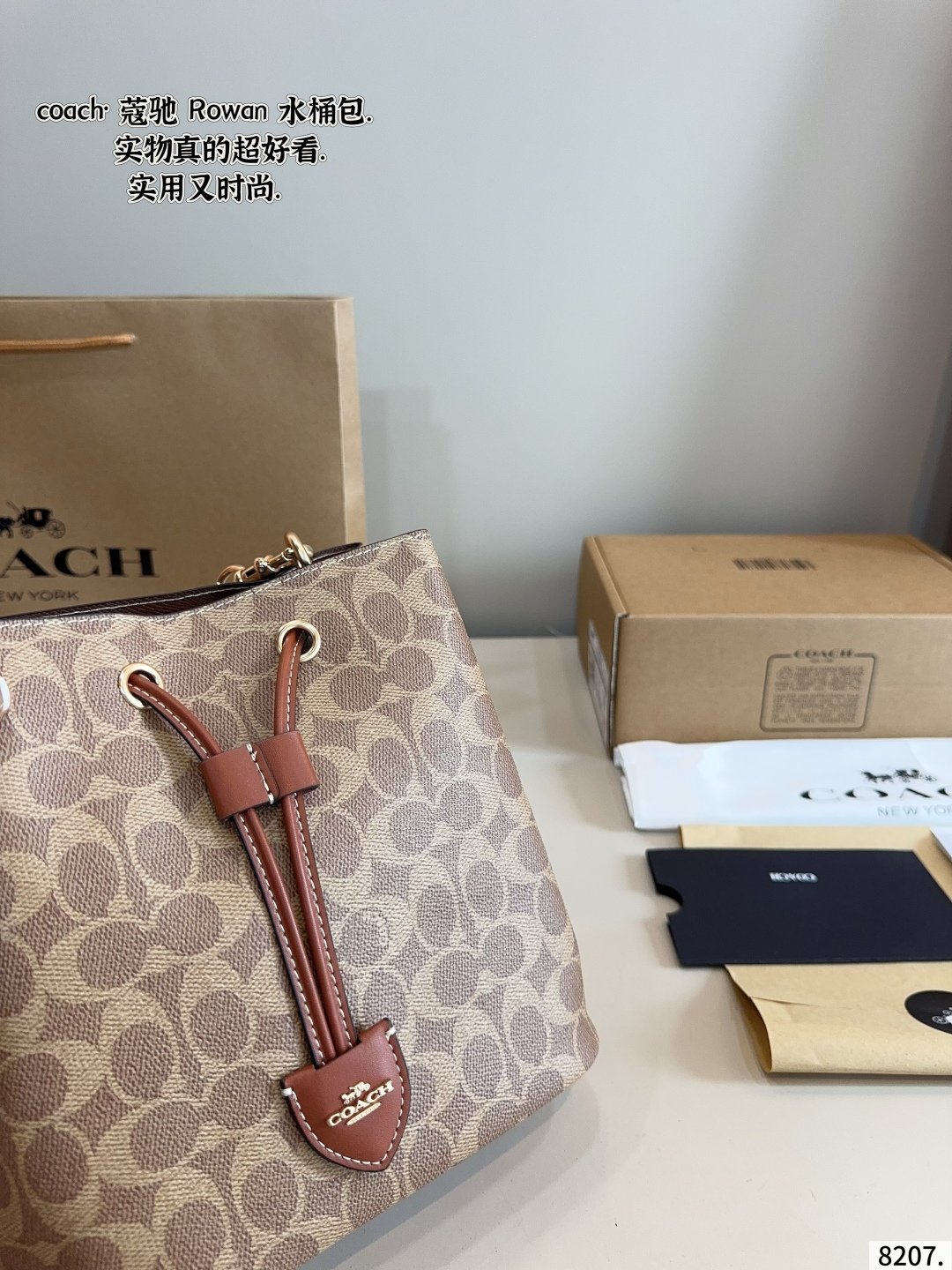 ‘-Brand and Series: This COACH Rowan bag is a bucket bag designed to combine practicality and style.