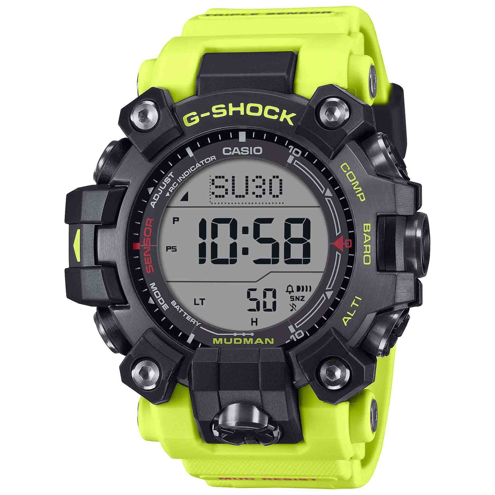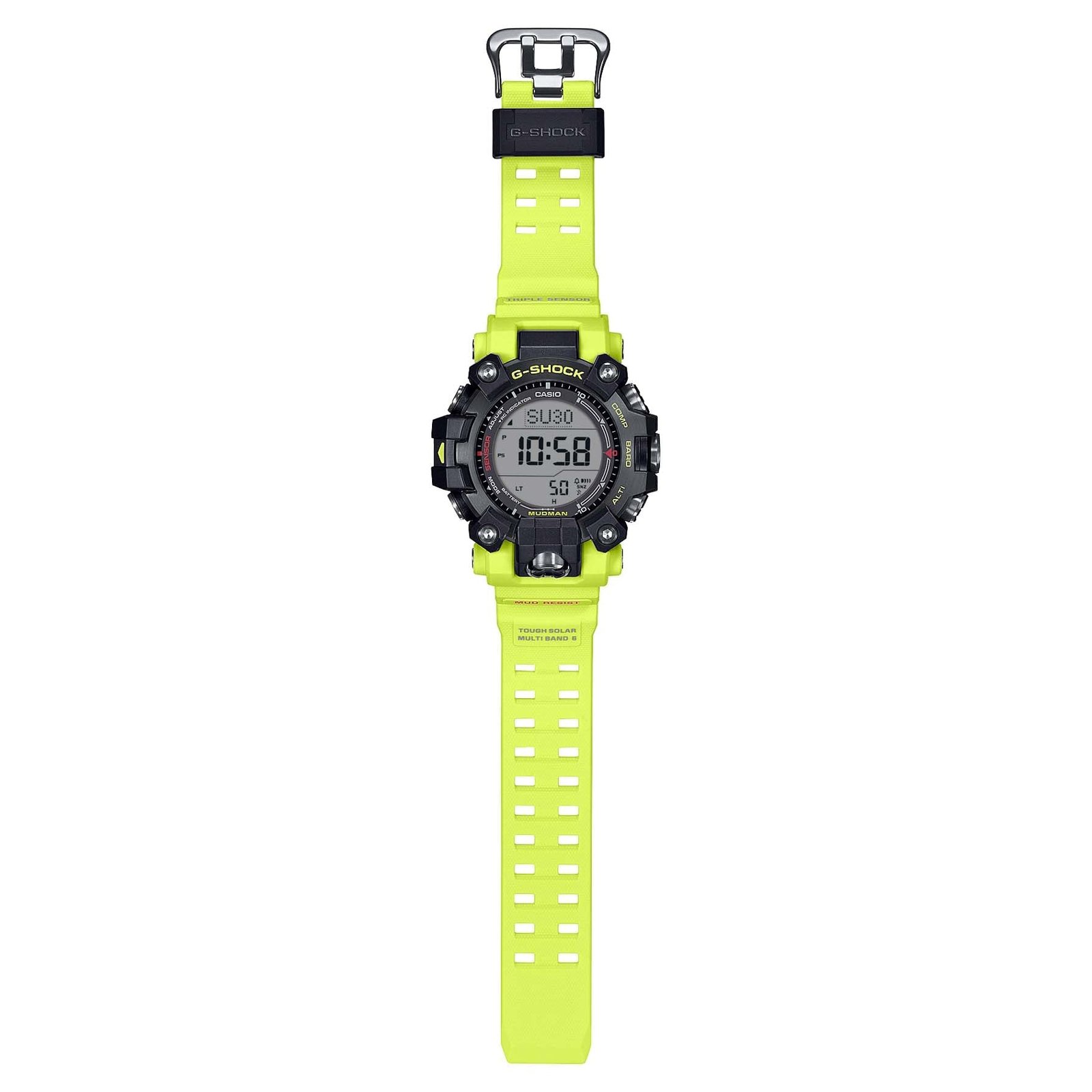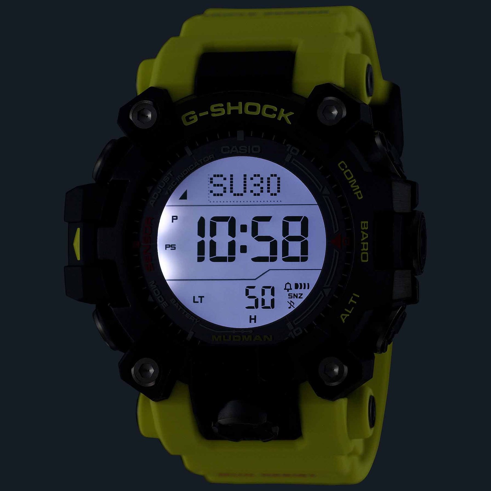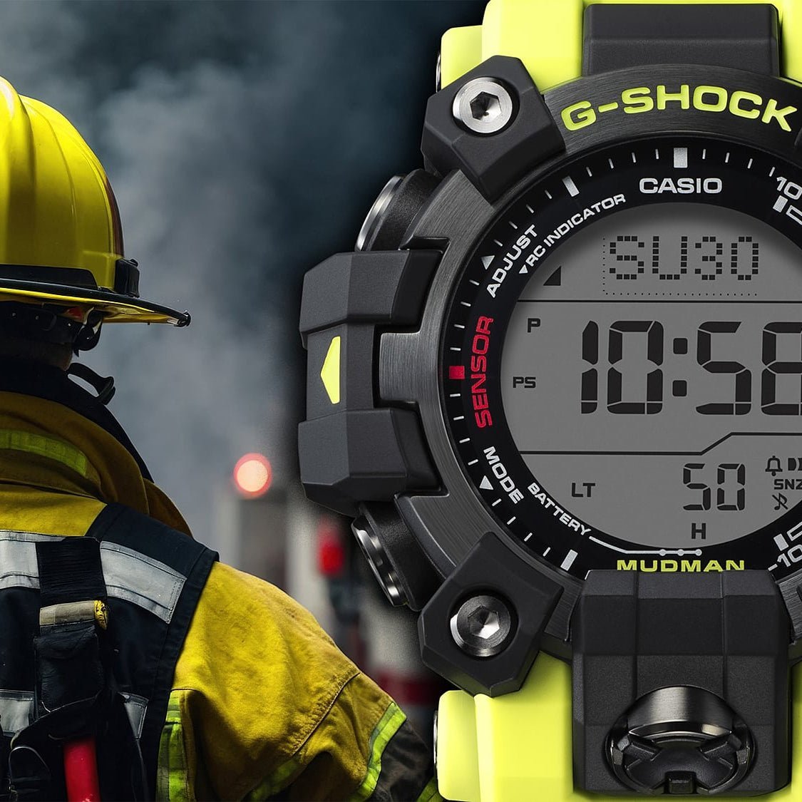 Whatever you’re doing. wherever you are ?? the G-SHOCK Master of G line has your back. For total support in the harshest environments. this MUDMAN watche delivers peak performance in punishing conditions on land. It features bold black to exude toughness and a band in the same bright yellow used for emergency rescues and safety signs. This innovative design is a sure fit for the world of professionals involved in rescue efforts and other critical missions.