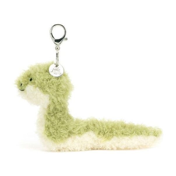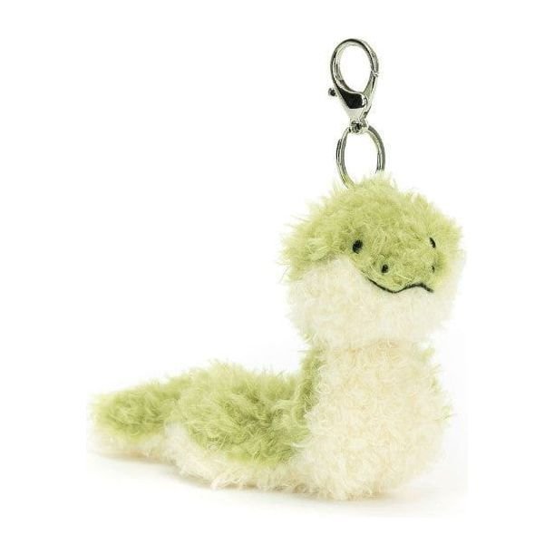 Little Snake Bag Charm is ready to slither along on every adventure. In tousled green and cream fur with embroidered facial features. this smiling serpent has a silver claw clip and Jellycat tag to attach to any bag for a ride-along reptile.