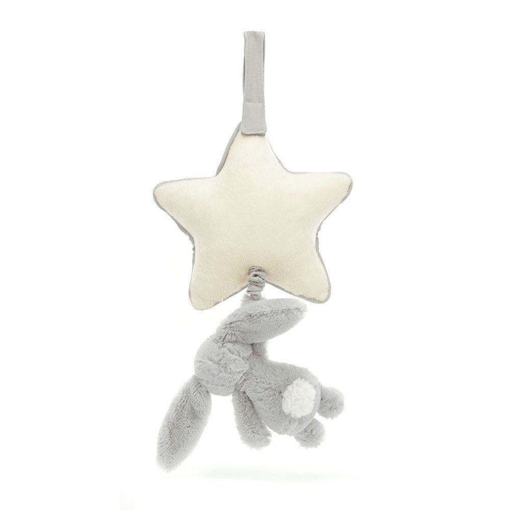 An enchanting newborn gift. let babies dream sweetly with a Bashful Silver Bunny Musical Pull. Our most loved Bashful Bunny. in soft. pale silver fur made from recycled fibres can be gently pulled to hear an original Jellycat lullaby. The cream star shaped musical pull with contrast trim can be attached to a crib or pram with a Velcro fastening.