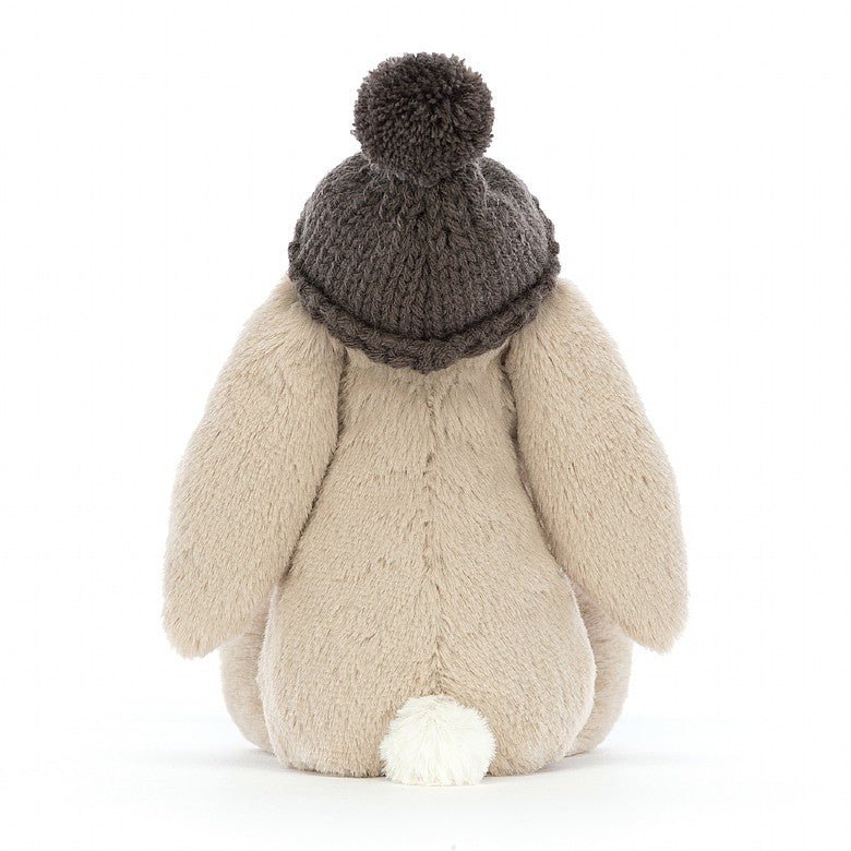 Bashful Toasty Bunny Beige plans to be cheery. even when it’s chilly! This stylish bun wears a charcoal hat in warm woollen knit. with a bobble on top! Lucky those ears are lopsy-lovely. so it fits just perfectly. Our bobtail buddy is snuggle-soft with biscuity paws and a pastel pink nose.
