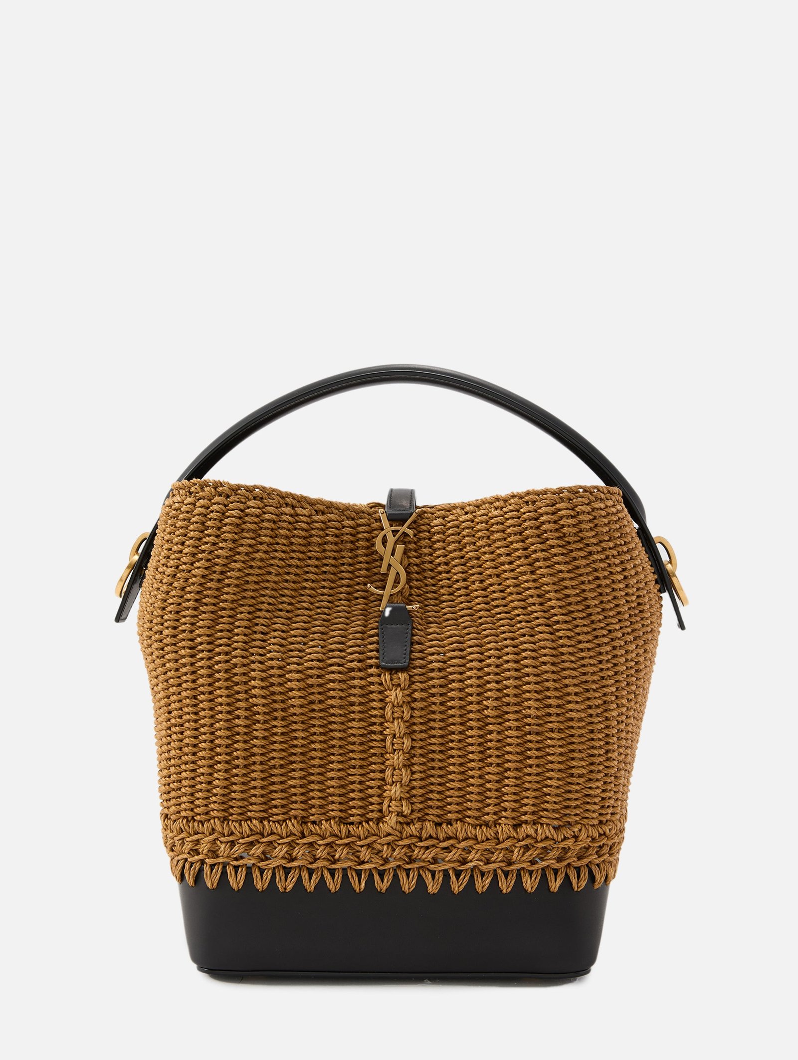 This luxurious bucket bag has a woven raffia figure. enhanced by the gleaming gold-tone YSL initials and matching hardware. Rather than a drawstring closure. this bag employs the Cassandre hook to gently secure the bag’s opening.