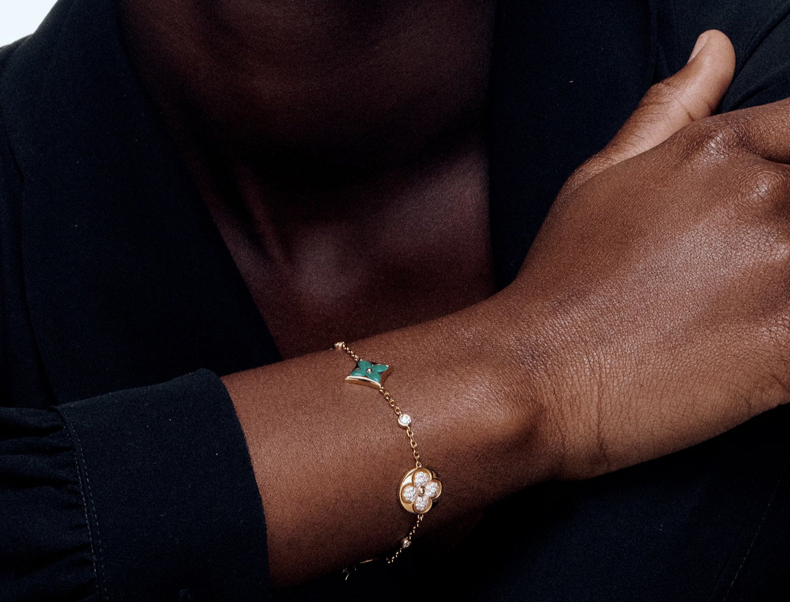 ‘-Fusion of Brand Elements: The bracelet incorporates Louis Vuitton’s iconic Monogram floral logo and the LV brand symbol. The four-pointed star-shaped turquoise flower and the round diamond-studded flower complement each other, perfectly embodying the brand’s signature design language.