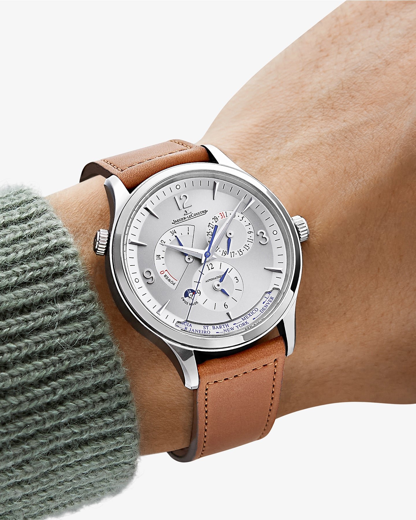 The ultimate travel watch. The new Master Control Geographic in stainless steel masterfully reinterprets an exclusive. signature Jaeger-LeCoultre complication. The iconic Geographic caliber allows travellers to roam the world. simultaneously reading the time at home and abroad. At the origin of this ingenious mechanism. a new-generation mechanical self-winding movement draws on a power reserve of 70 hours. For the well-traveled. time saved is always precious.