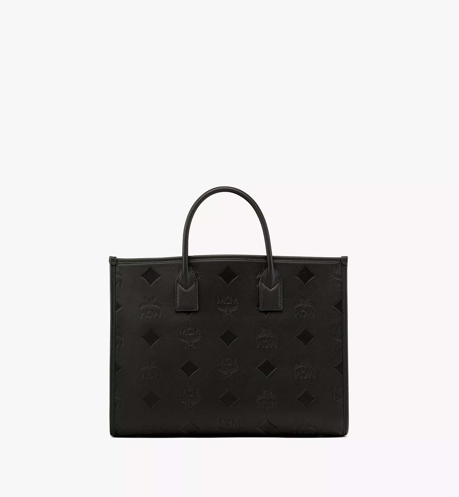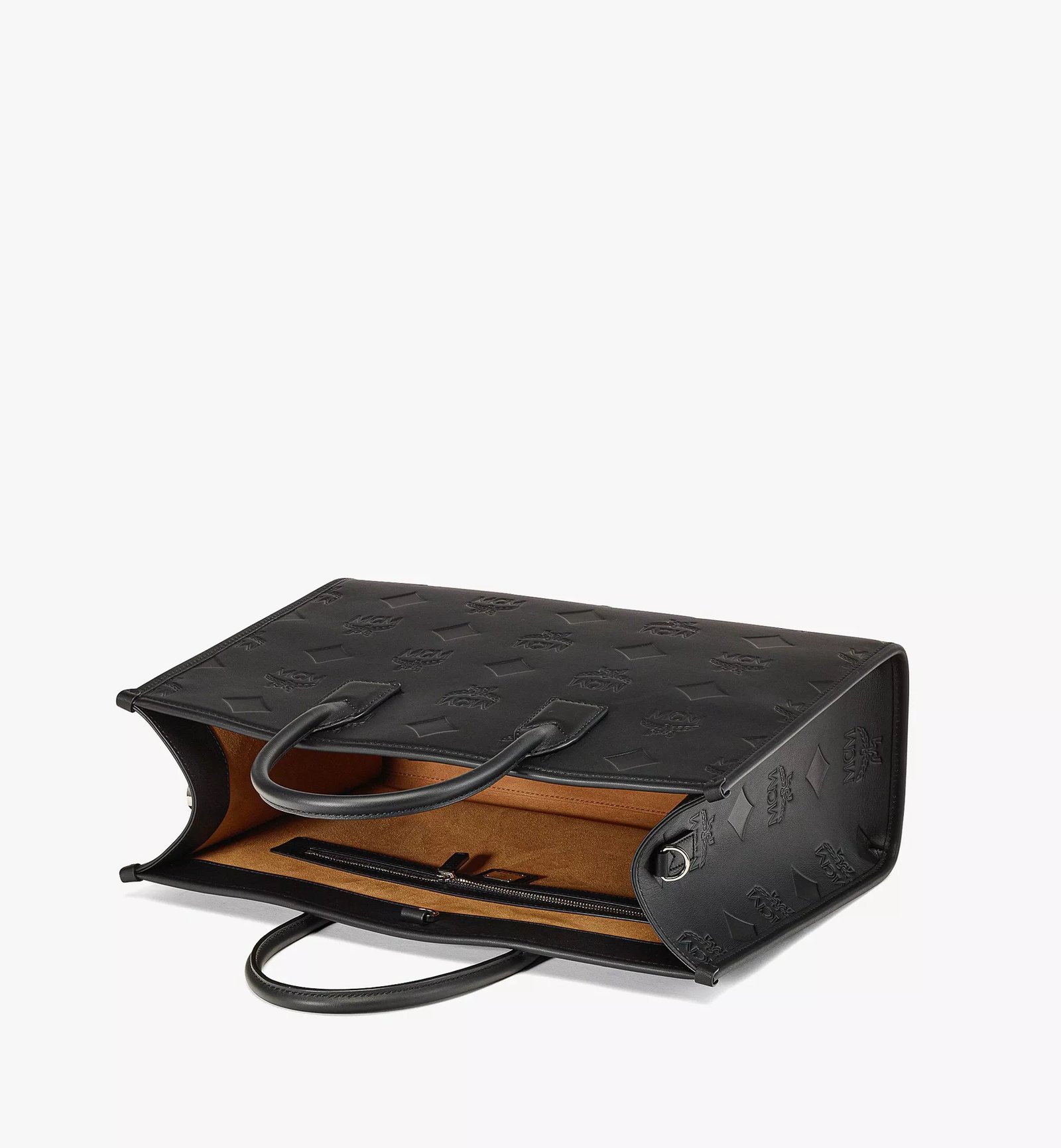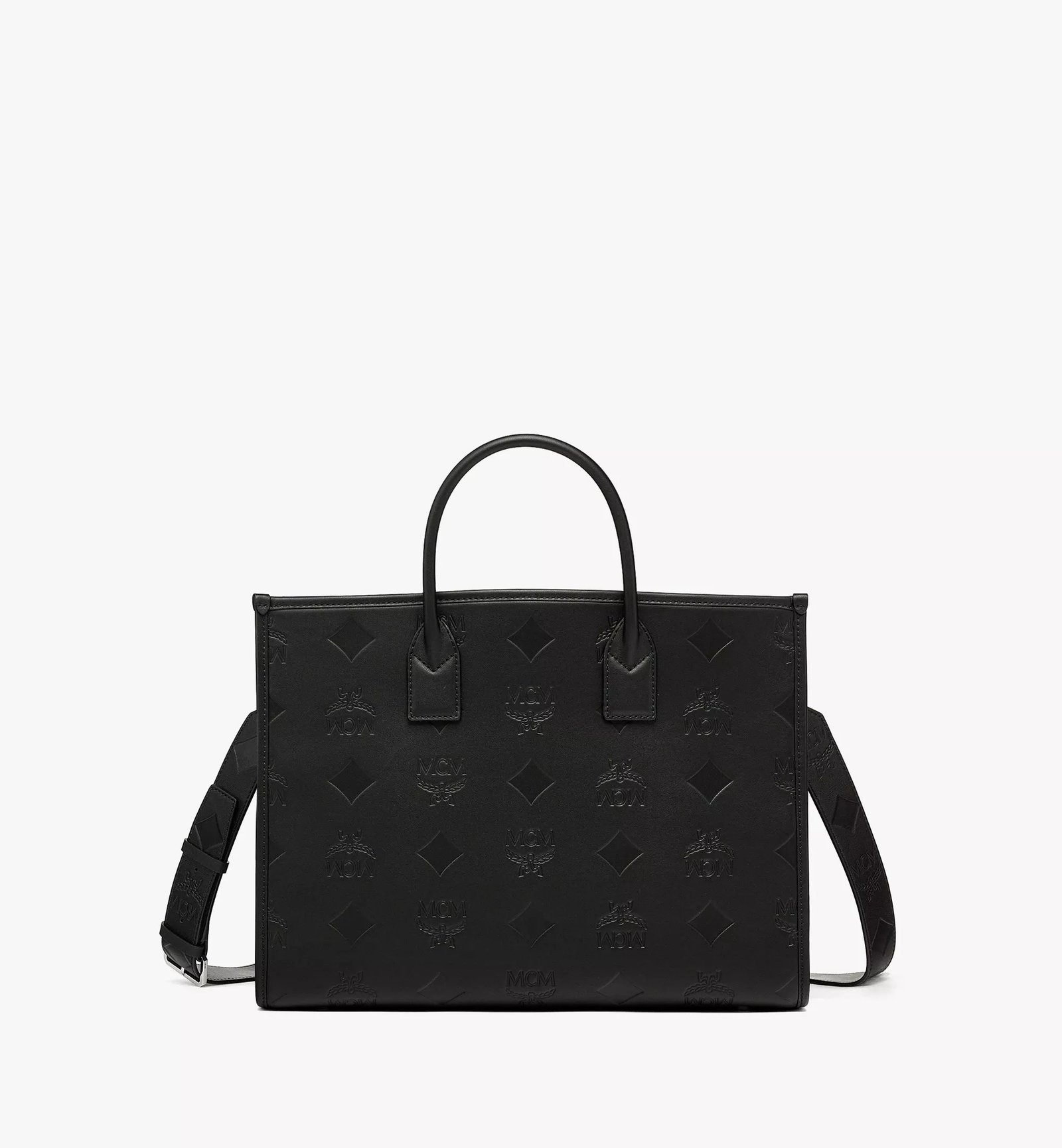 ‘-Logo: The bag features embossed patterns in classic MCM Visetos. The brand’s initials, diamond, and eagle logo are embossed in a three-dimensional pattern. Against the all-black exterior, the design maintains the brand’s recognizability while adding a touch of understated luxury.