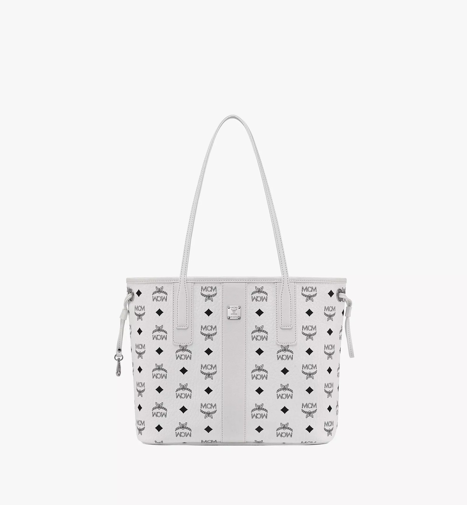 -Details: Two slender leather straps allow for easy shoulder carry; drawstrings on both sides allow for flexible volume and styling adjustments; and a metal MCM logo plaque on the front adds a touch of sophistication.