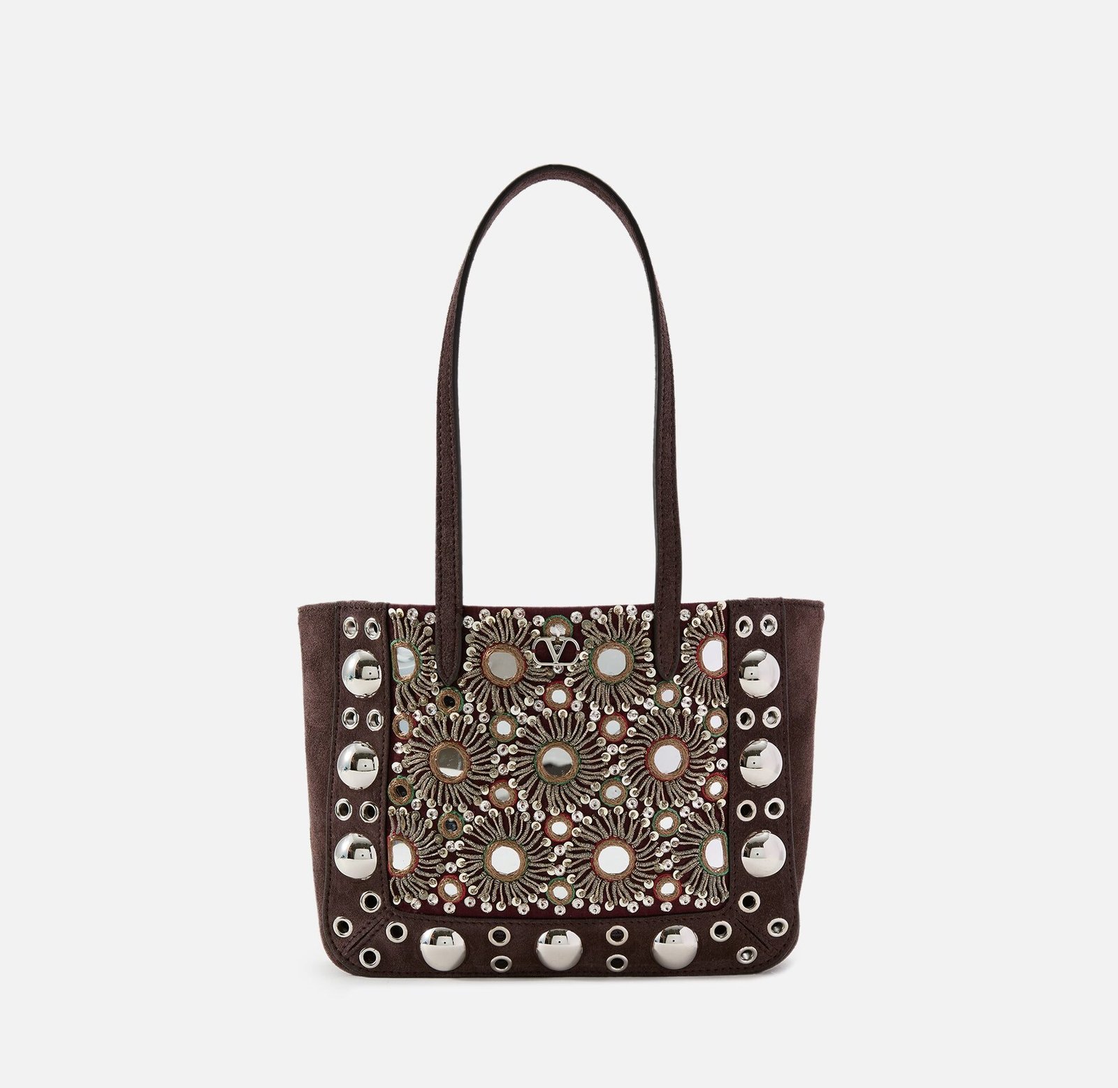 The Nellcote Bag offers a perfect blend of boho flare and functionality. It features a suede finish adorned with decorative ball studs and rivets. The bag is endlessly wearable by shoulder or in hand. thanks to a classic tote silhouette.