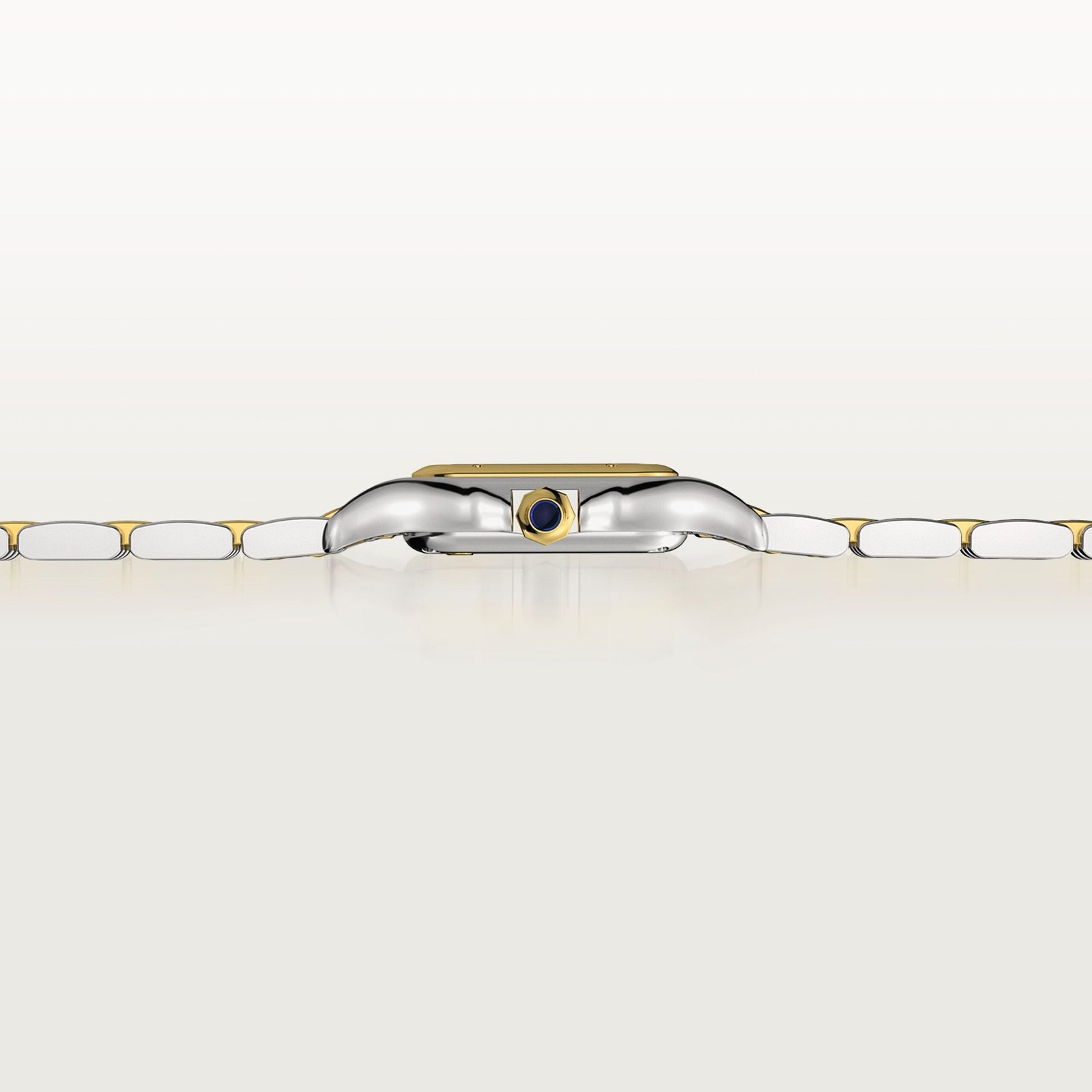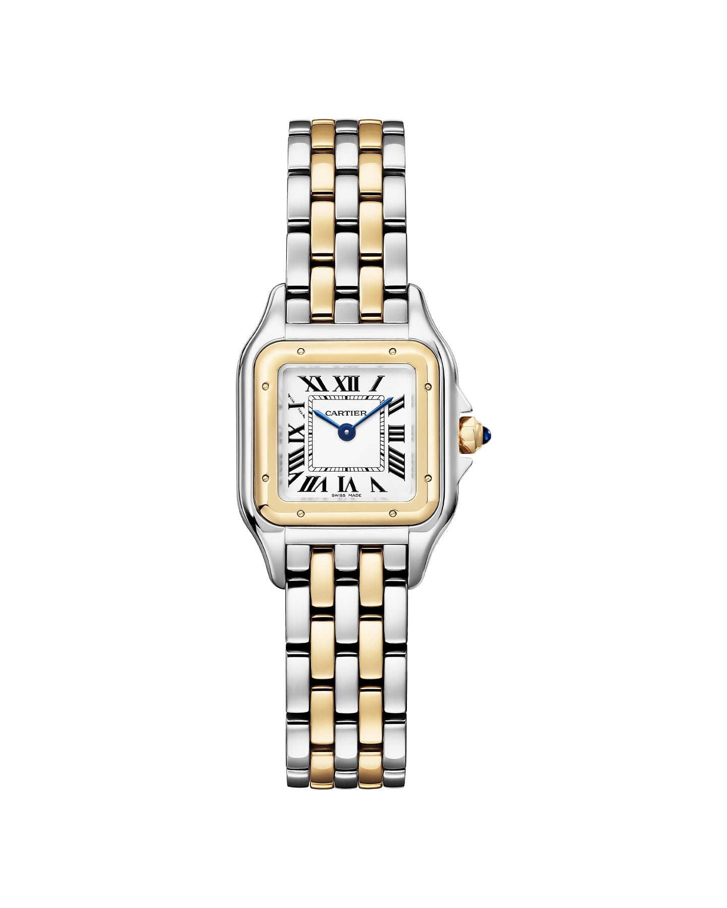 Panth??re de Cartier watch. small model. quartz movement. Case in yellow gold 750/1000 and steel. dimensions: 23 mm x 30 mm. thickness: 6 mm. crown set with a synthetic blue spinel. silvered dial. blued-steel sword-shaped hands. bracelet in yellow gold 750/1000 and steel. Water-resistant to 3 bar (approx. 30 meters).