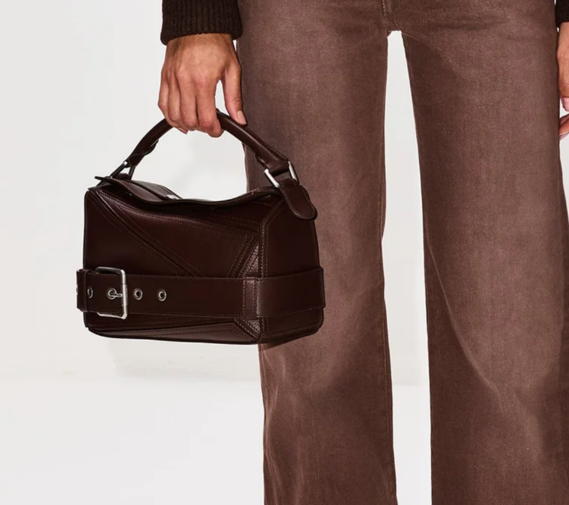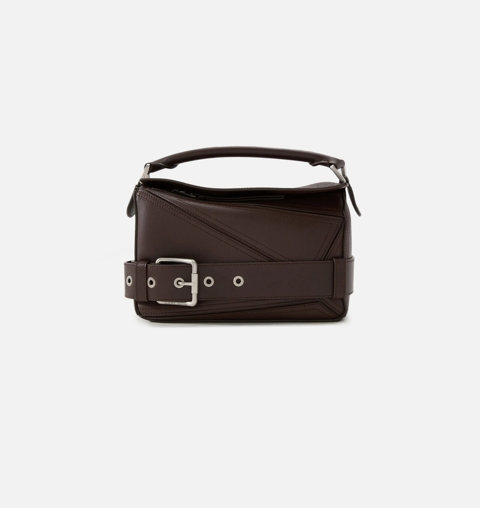 Loewe proves their Small Puzzle Bag is the missing piece to a well-curated purse collection. Reach for this artful accessory to add interest to your look. Details to be admired: geometric design. contrast stitching and a top handle with an added biker buckle strap around the exterior.