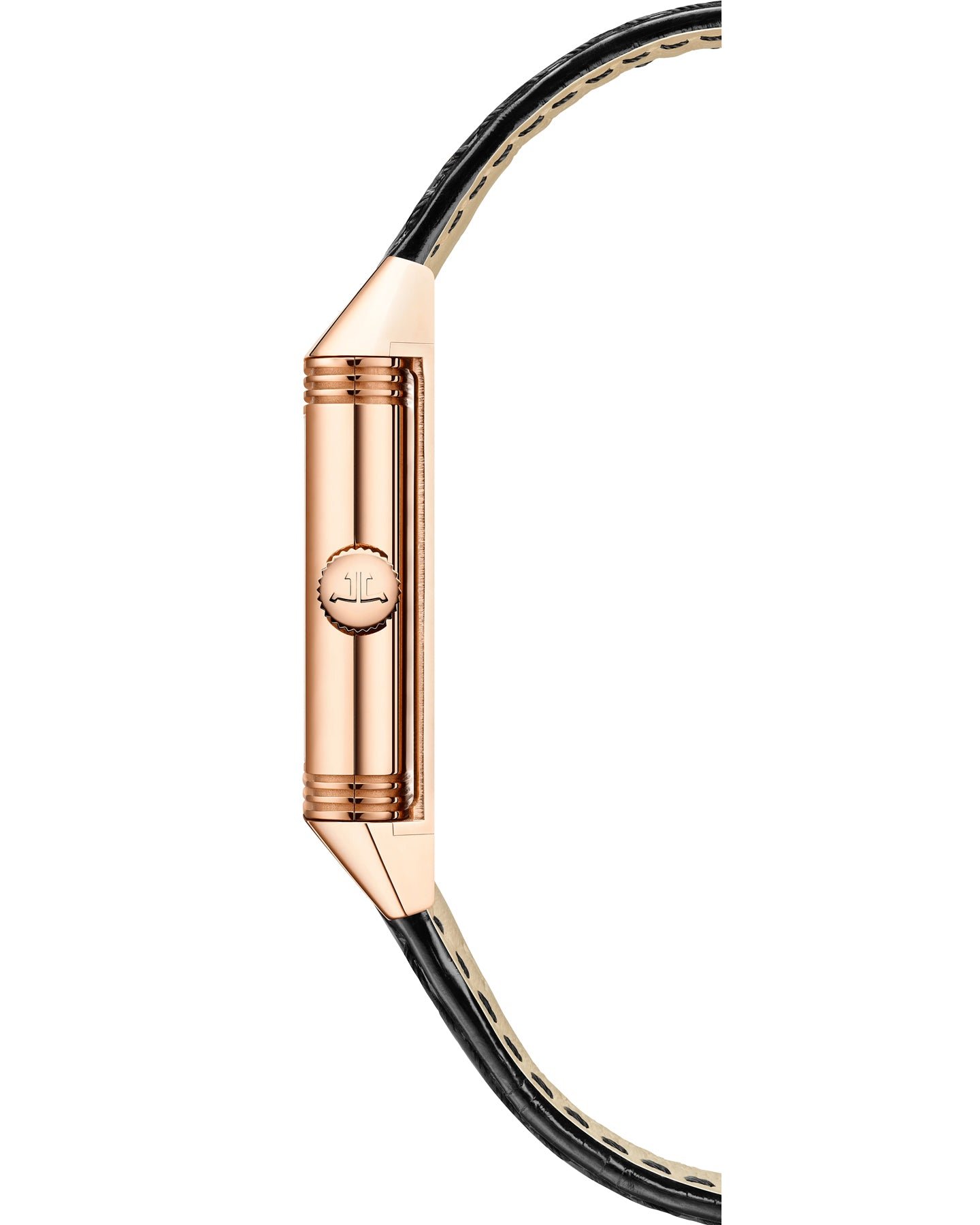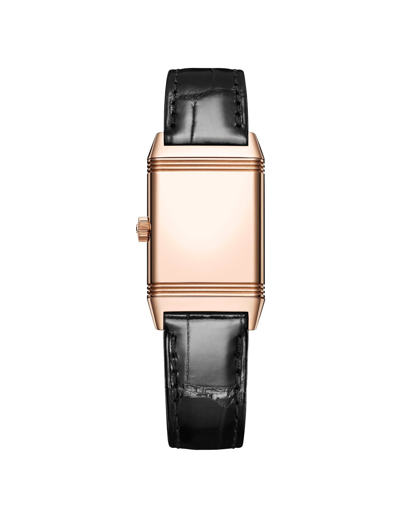 With its new pink gold case enhanced by a black leather strap. the Reverso Classic Small watch exudes a look that will appeal to connoisseurs of vintage treasures. At the heart of this watch lies a manual winding mechanical movement. the Jaeger-LeCoultre Caliber 846/1. Its restyled dial features golden hands. Twelve straight black transferred Arabic numerals stand out against a minute track.