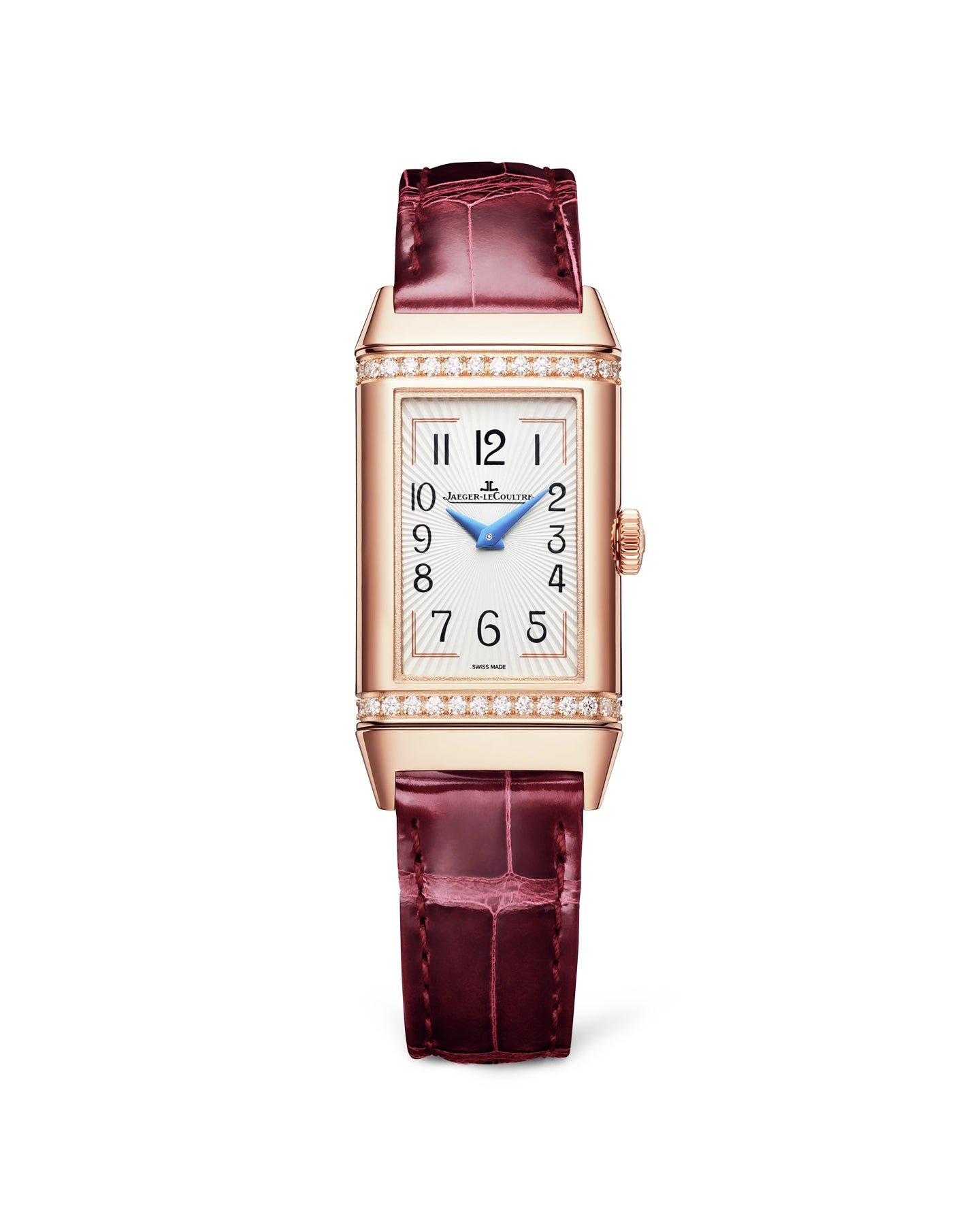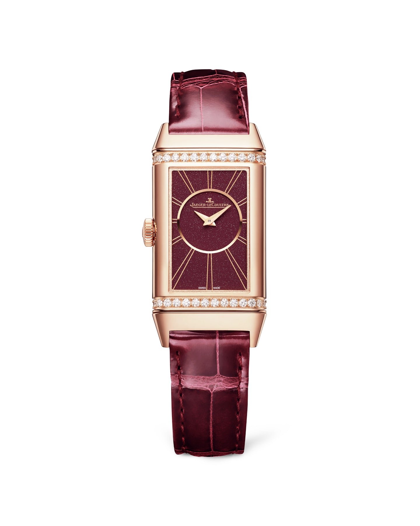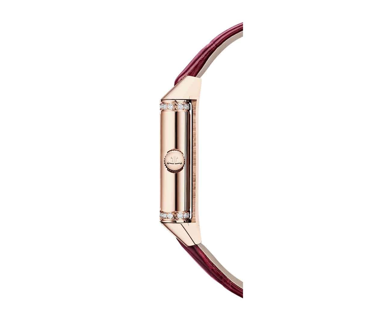 Inseparable from the refined woman who loves a change without losing her identity. the new Reverso One Duetto in pink gold accompanies the hours of the day and the night. Instead of choosing between a watch or jewelry. this timepiece embodies both. With two rows of brilliant-cut diamonds. this timepiece takes its audacity from the shimmering color of its satin-finish alligator leather strap.