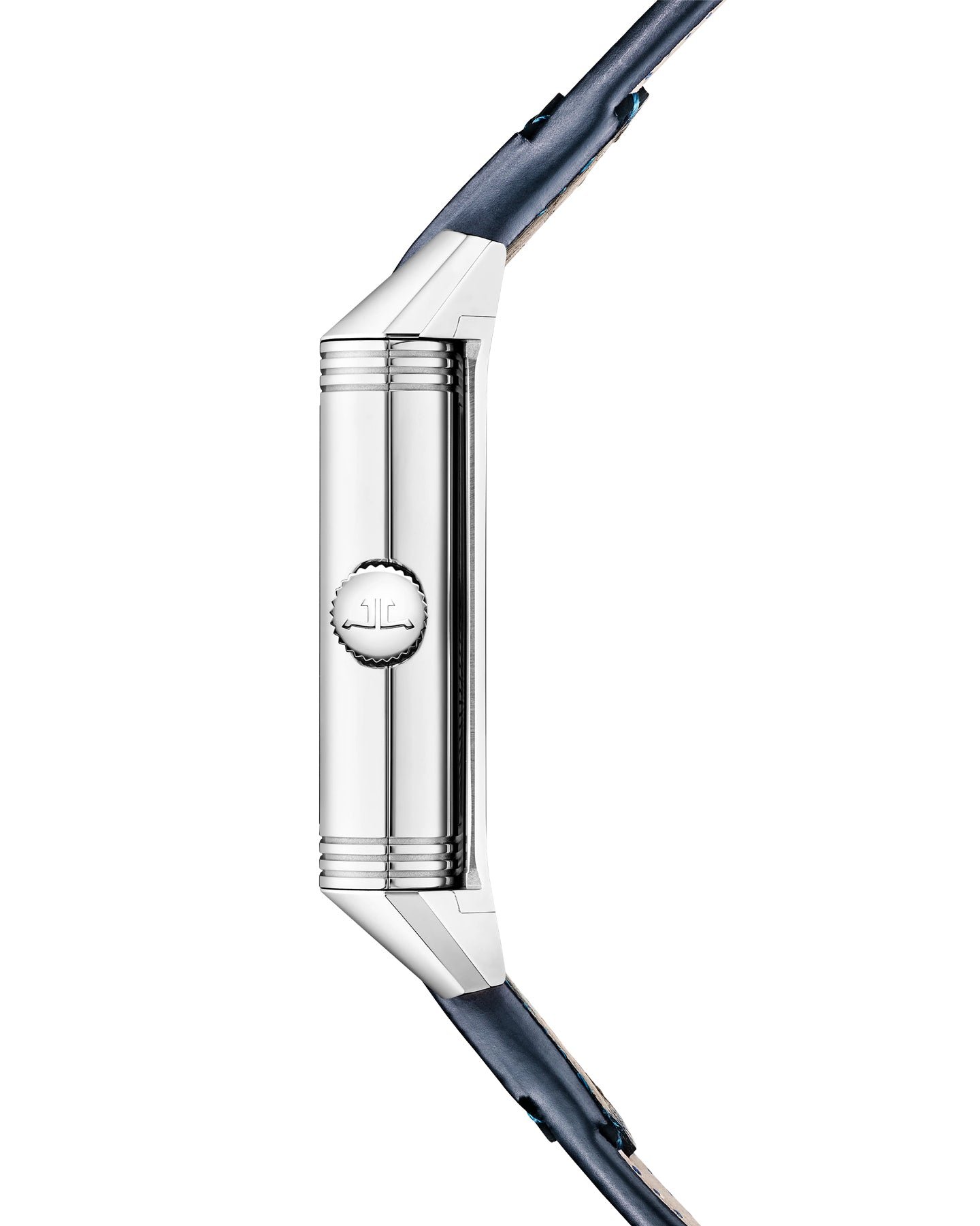 Featuring the Duoface complication. the Reverso Tribute Duoface Small Seconds watch is inspired by the Art Deco codes of the very first models from 1931. On the front. the sunray-lacquered blue dial clearly displays its attributes and functions: railroad minute track. trapezoidal applied indexes. Dauphine hands and small seconds at 6 o’clock. On the reverse. the sunrayed silver dial gives way to a Night & Day indicator centred at 6 o’clock. The second time zone is easily set by means of a trigger on the side of the steel case. The watch is equipped with two bracelets designed by Casa Fagliano: the first in blue leather. the second in the same colour. leather and canvas.