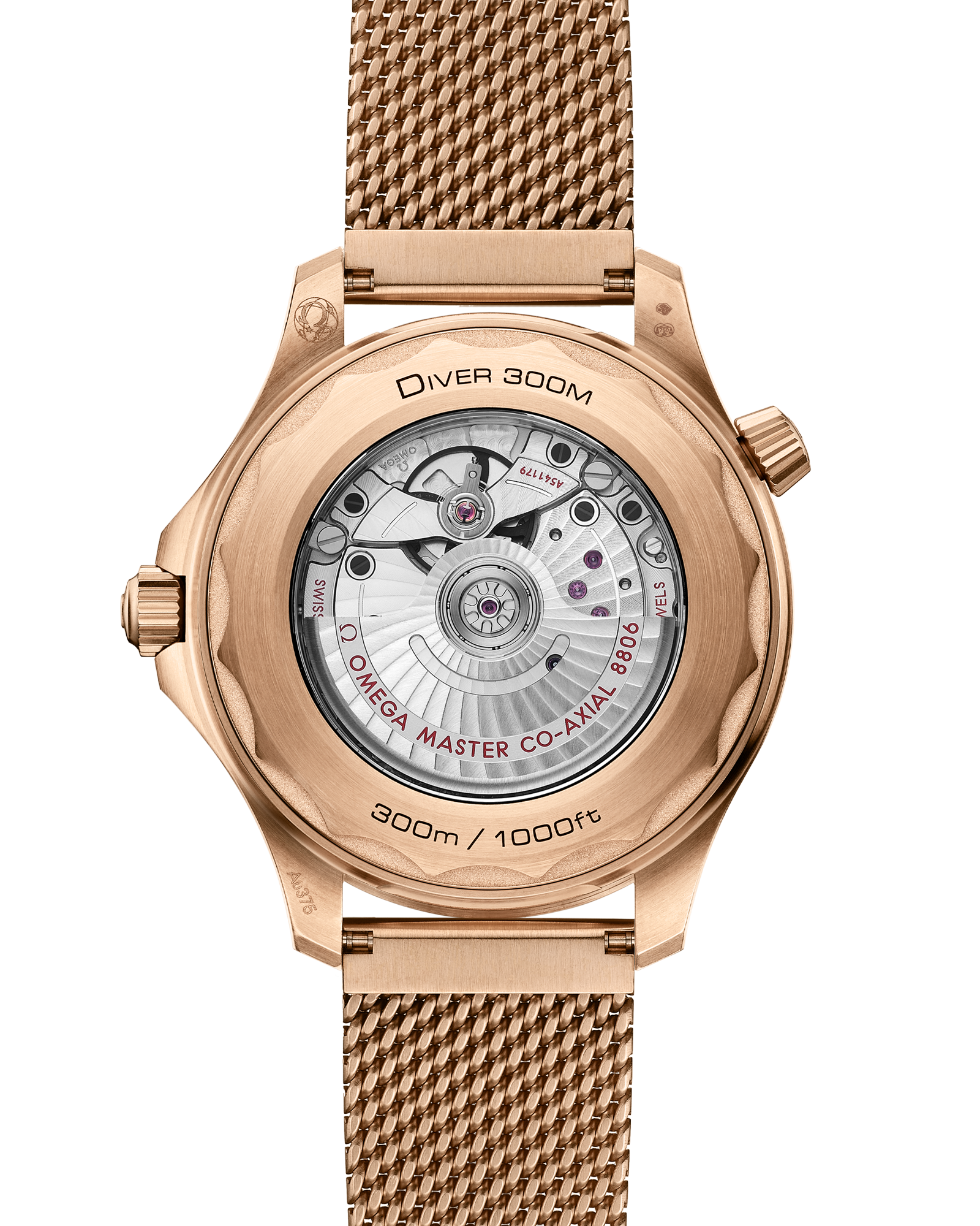 The watch is presented on a brushed mesh bracelet with clasp. and is driven by the OMEGA Co-Axial Master Chronometer Calibre 8806. which can be seen through the sapphire-crystal caseback.