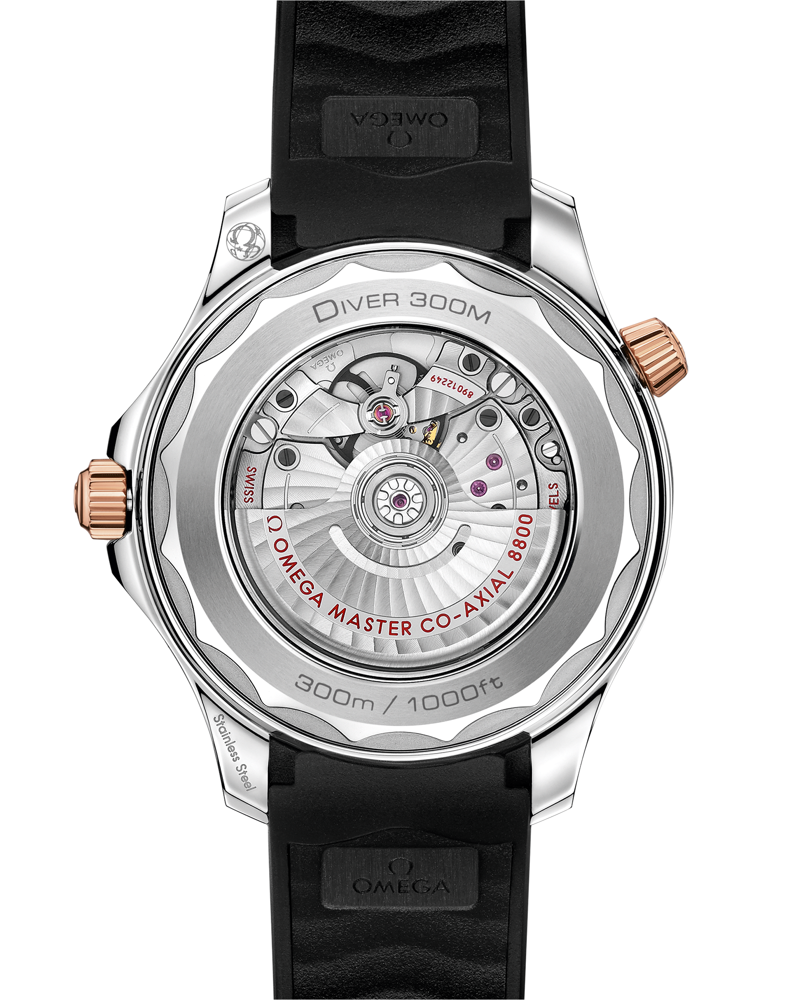 The watch is presented on a black rubber strap and is driven by the OMEGA Master Chronometer Calibre 8800. which can be seen through the sapphire-crystal on the wave-edged caseback.
