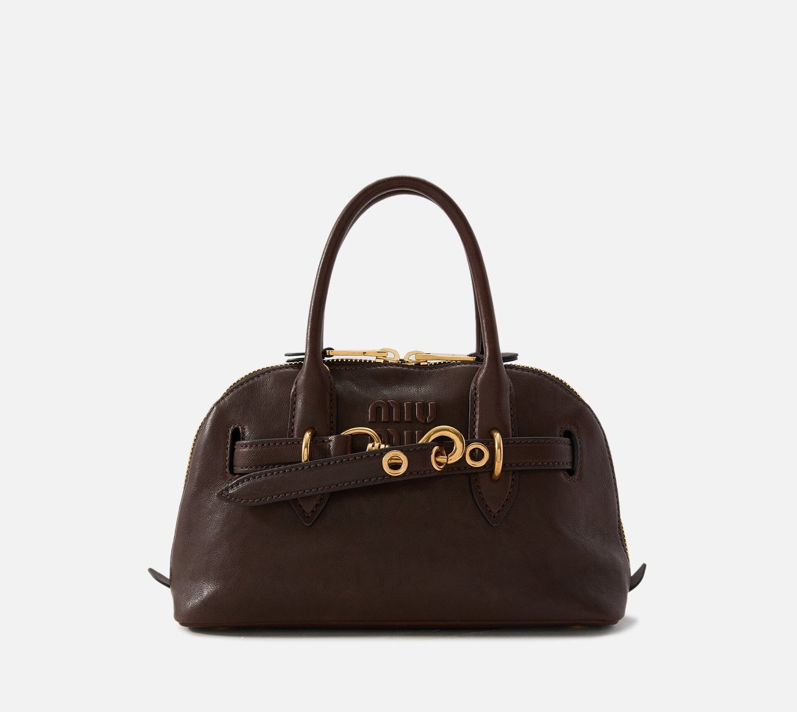 The Aventure bag has been reimagined from the Miu Miu archives with a classic top handle design. featuring embossed lettering on elegantly textured Nappa leather.
