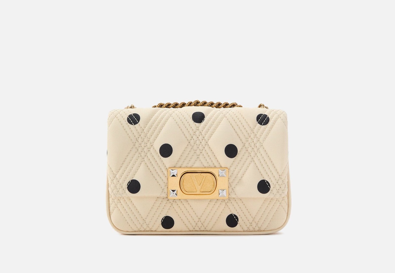 Valentino Garavani’s exquisite bag features a luxurious quilted satin finish with a mixed metal gold-tone closure showcasing the designer’s iconic VLOGO hardware and Rockstuds front and center.