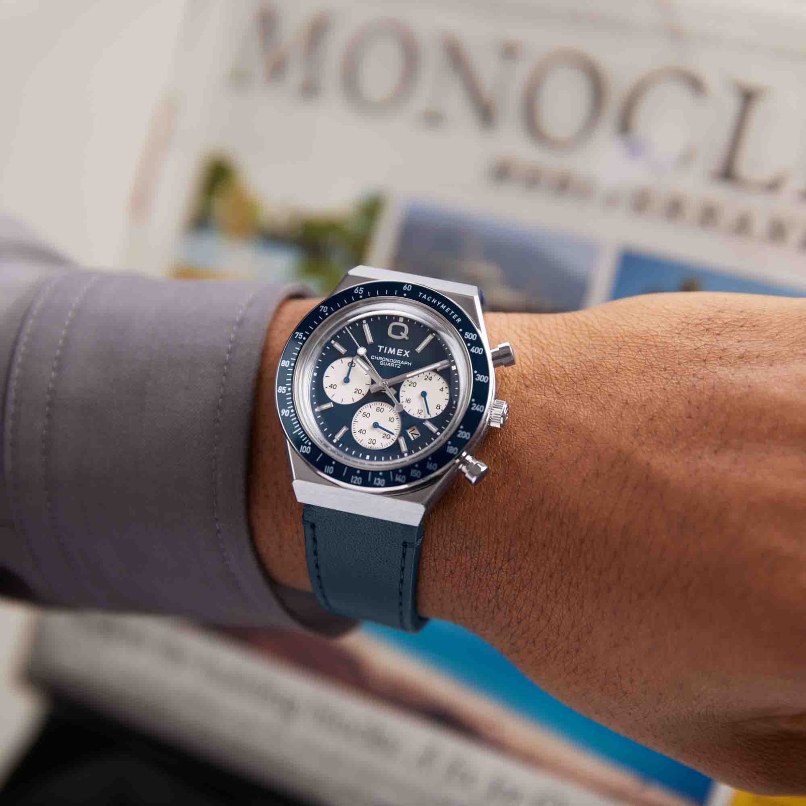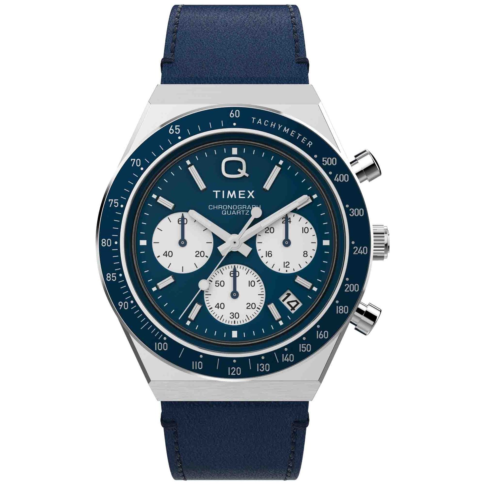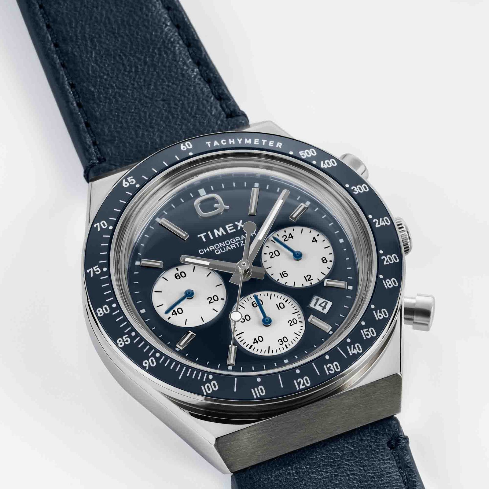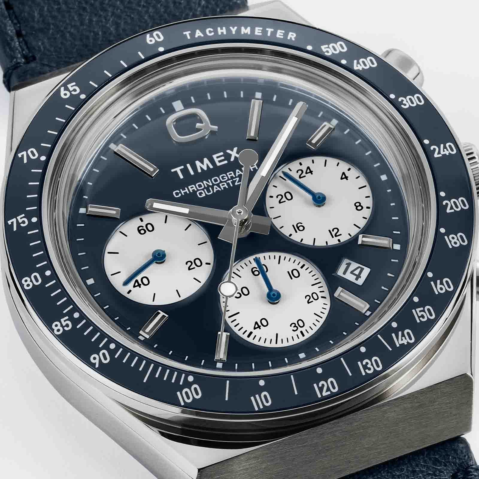 Roar across the finish line with the high-performing Q Timex Chronograph. Inspired by the original motoring watches that graced the tracks of Europe’s most iconic races. this timepiece celebrates the endurance of the legendary 1970s Q Timex. An ultra-precise chronograph movement and tachymeter bezel recreate the finesse and function of a true racing watch. allowing you to determine elapsed time and average speed like the greatest daredevils in motorsports. Contrasting sub-dials. a date feature. hand-applied dimensional indices. and an updated Q Timex logo stand beautifully against a white dial. while a stainless-steel crown and brushed and polished 40mm stainless-steel case bring dynamism and durability to its retro construction. Infinitely wearable. it presents with a natural leather strap sourced from the Leather Working Group (LWG).