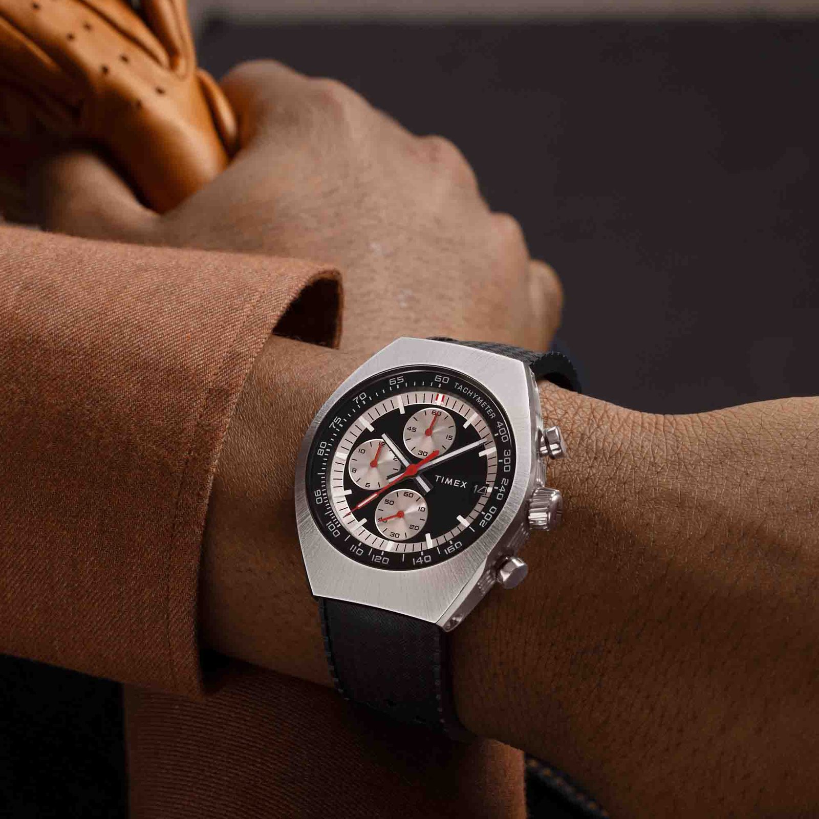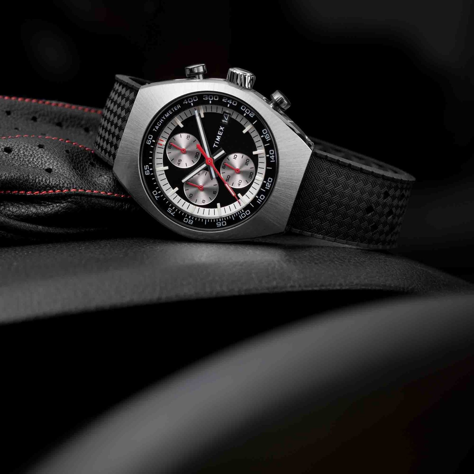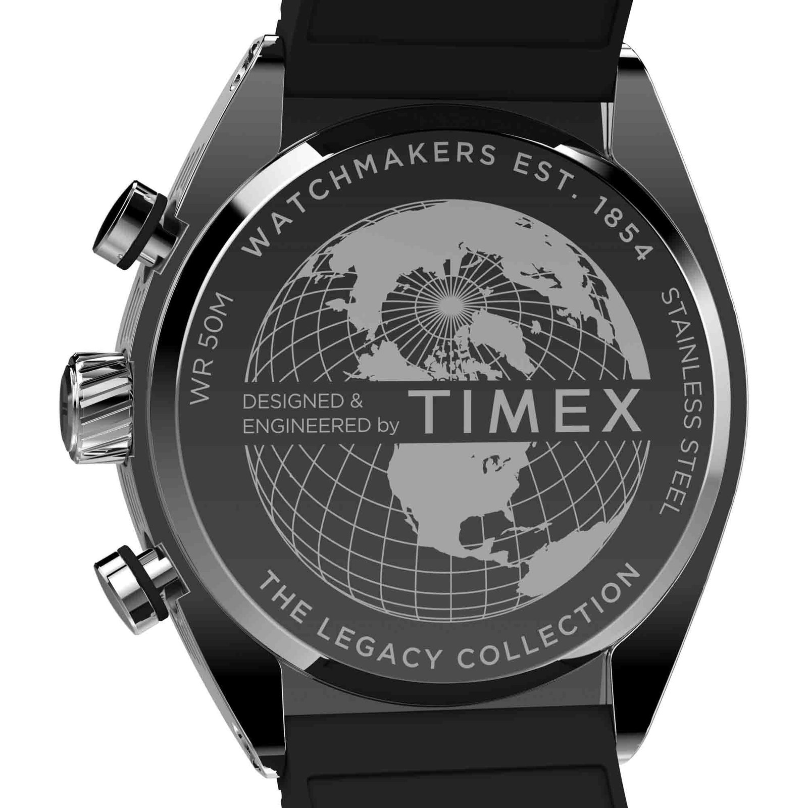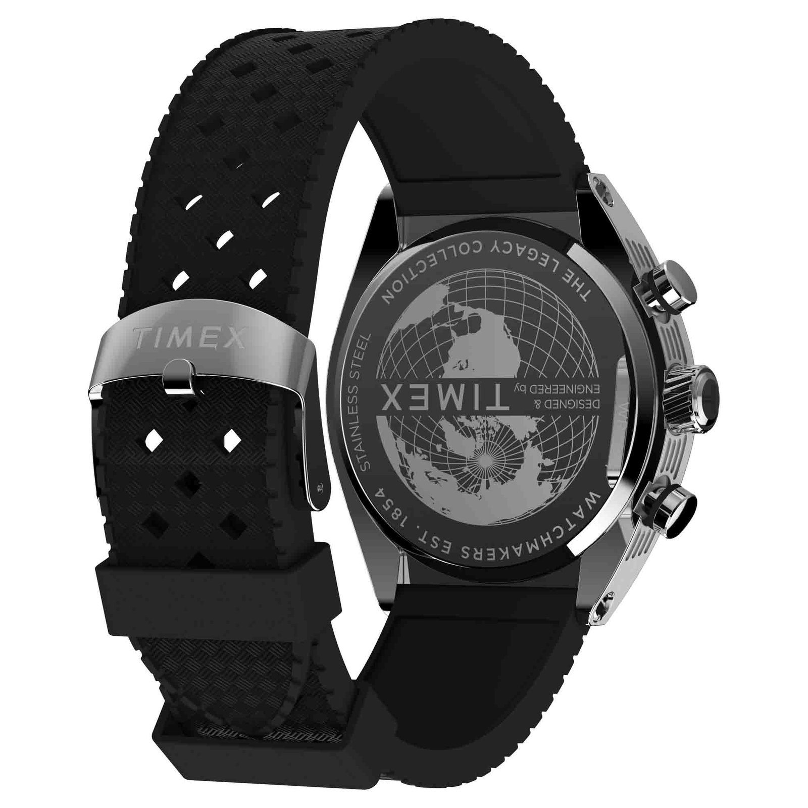 Designed to be visually striking. the Timex Legacy Tonneau Chronograph draws inspiration from the iconic watch styles of the ’70s. Its sizable 42mm barrel-shaped stainless-steel case houses an elaborate. multi-layered dial with a date window beside the 3 o’clock mark. Sunburst brushing on the top of the case and intricate detailing on the case. crown. and pushers bring this polished timepiece even more sophistication. while bright red hands and a black synthetic rubber strap give it a sportier edge.