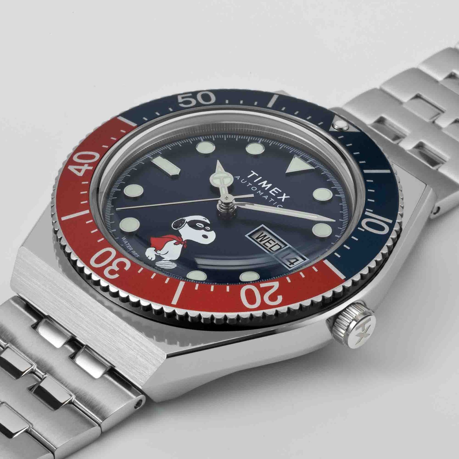 Snoopy takes center stage as the legendary masked marvel on the blue sunray dial of the cherished M79. Featuring an automatic movement. a blue and red unidirectional bezel. luminous hands and dial markings. a stainless-steel bracelet with quick-release spring bars. and exhibition case back. this modern watch captures the bold spirit of an era that changed everything (and the spirit of your favorite beagle. of course).