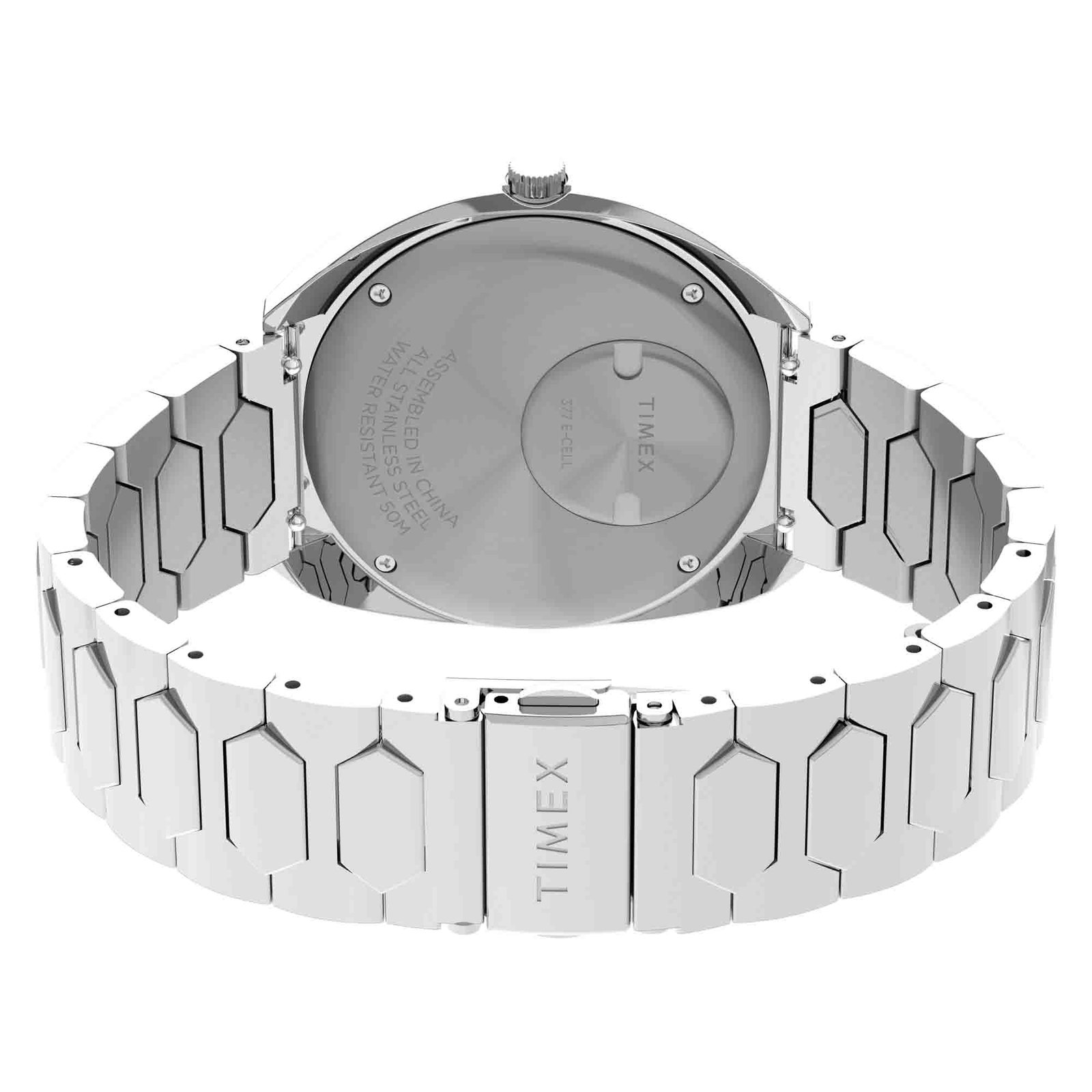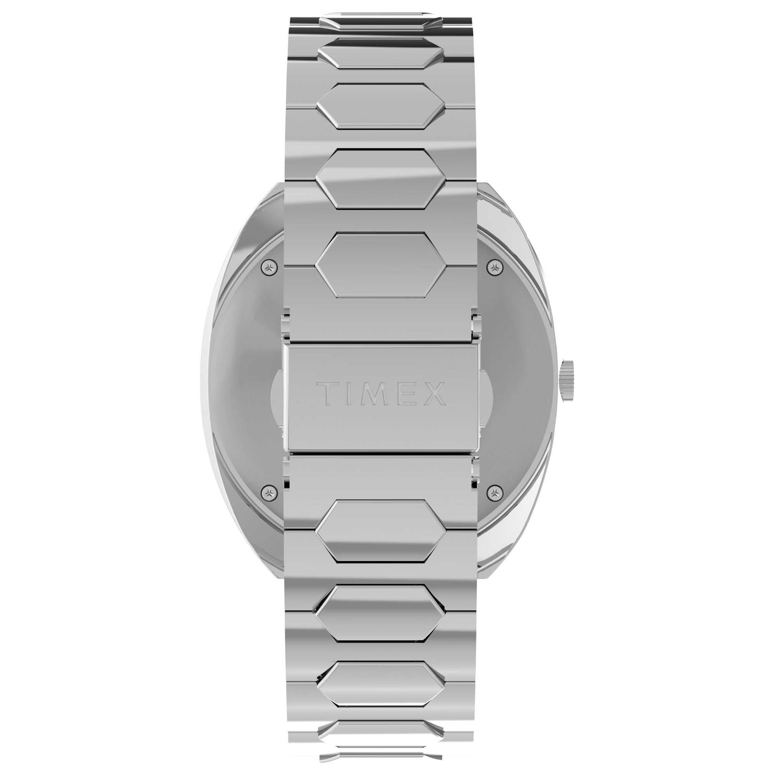 This 1972 blast from the past is an archival quartz watch that delivers ’70s boldness from every angle. boasting a substantial 39mm recycled stainless-steel tonneau case with all-around polished finishing. You’ll find our usual attention to detail with dimensional floating hour markers that hover above the dark blue sunray dial. plus a polished handset to match. a trapezoidal date window. and a period-correct domed acrylic crystal on top. Completing the look. a bold geometric bracelet thoughtfully crafted from polished recycled stainless steel adds a modern edge to this nostalgic. reissued design.
