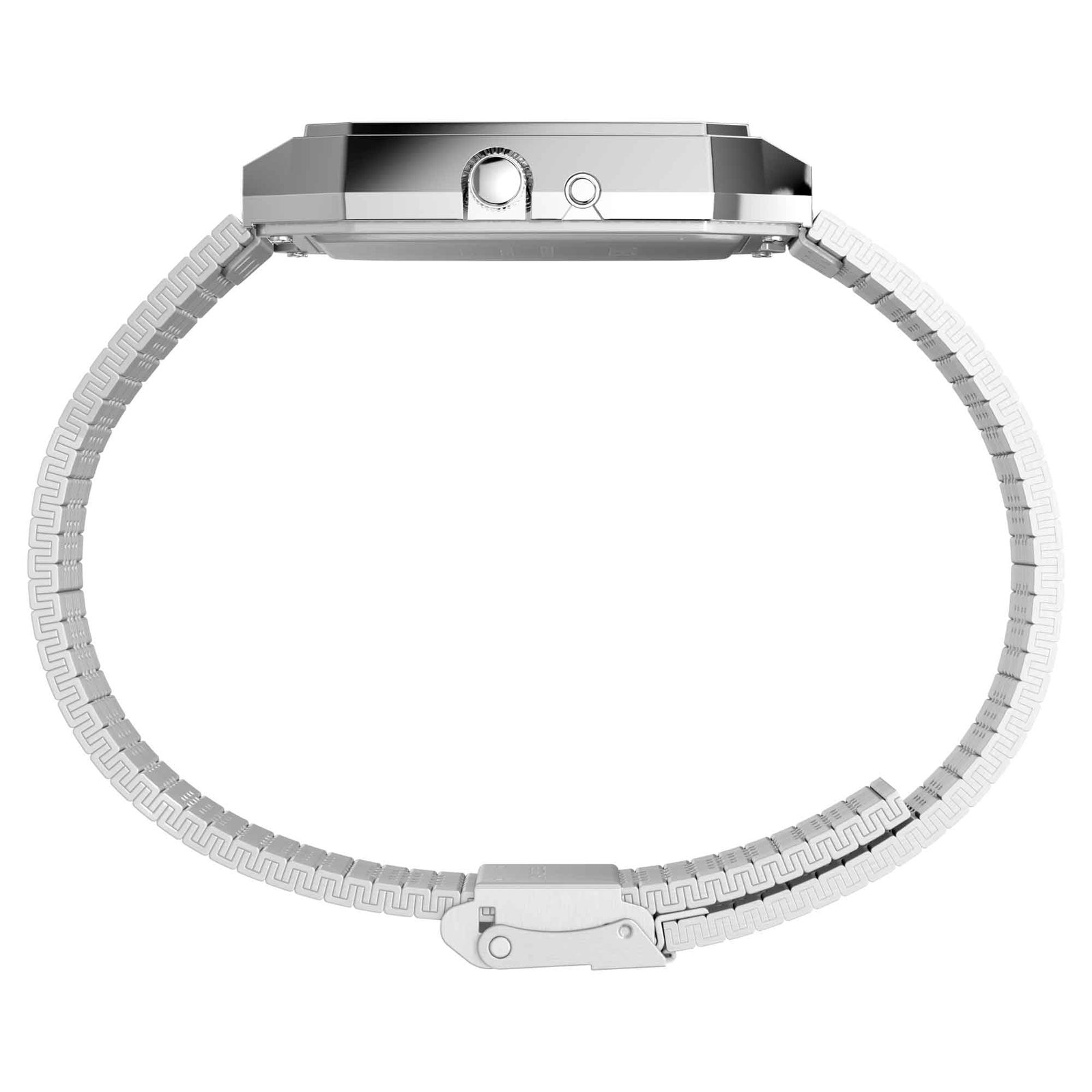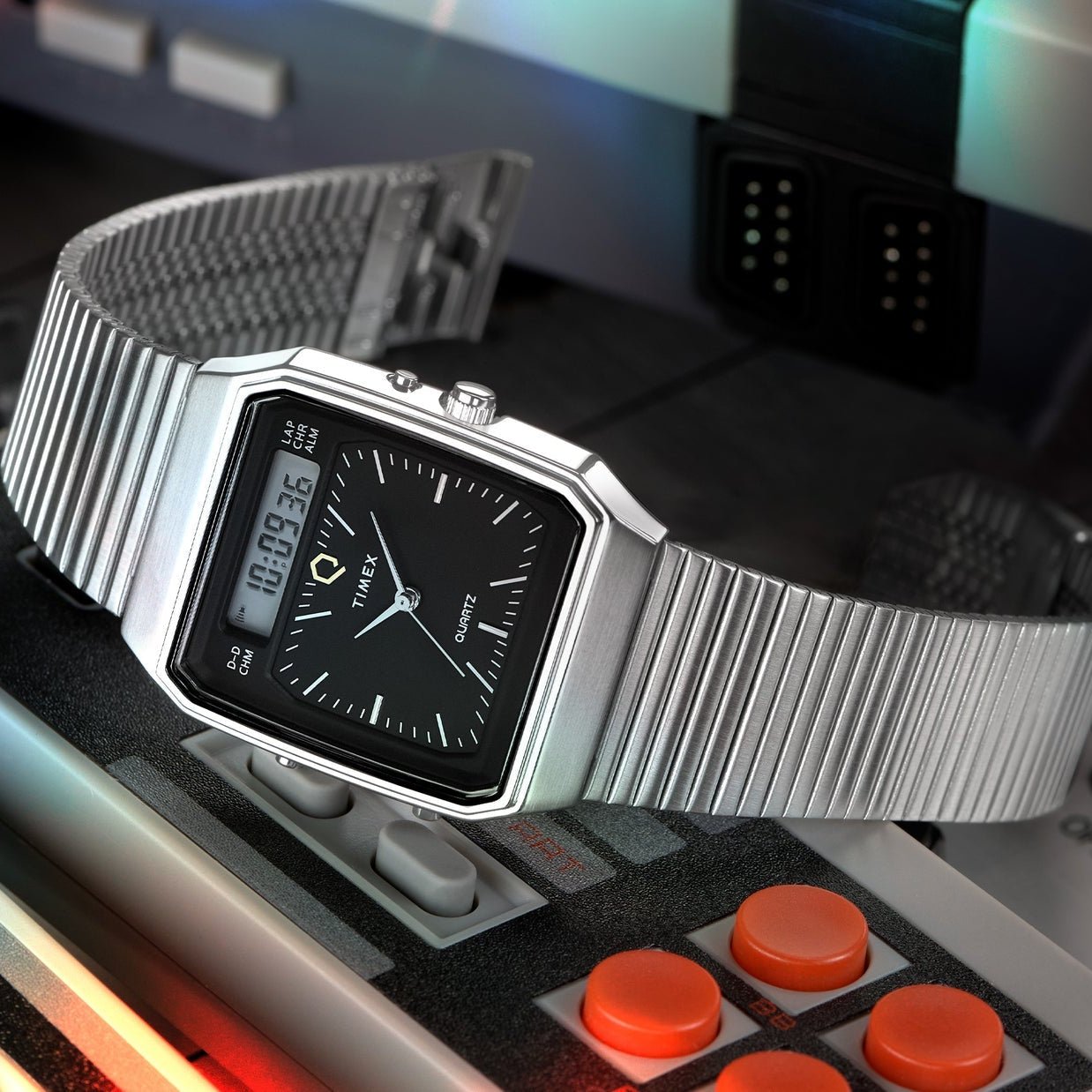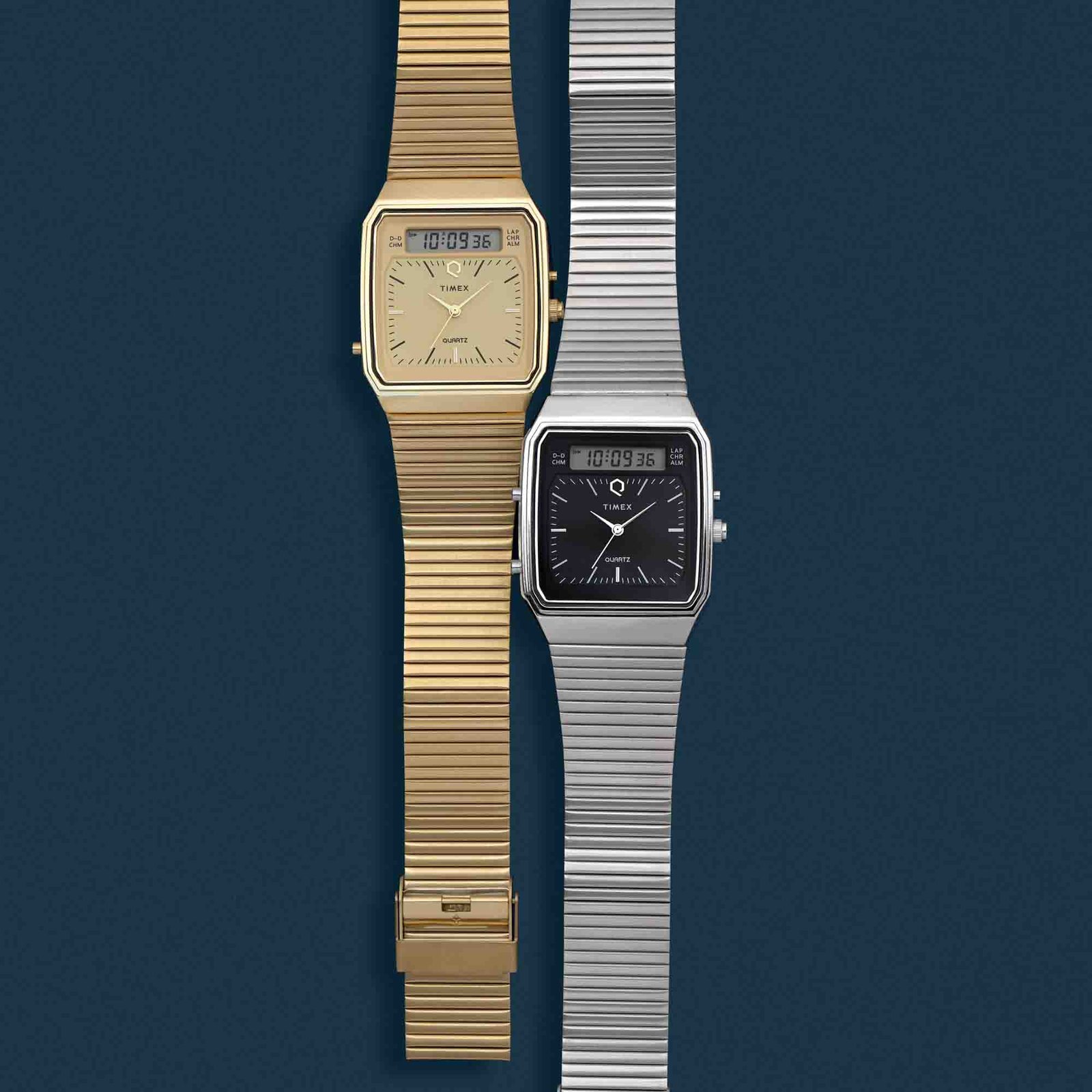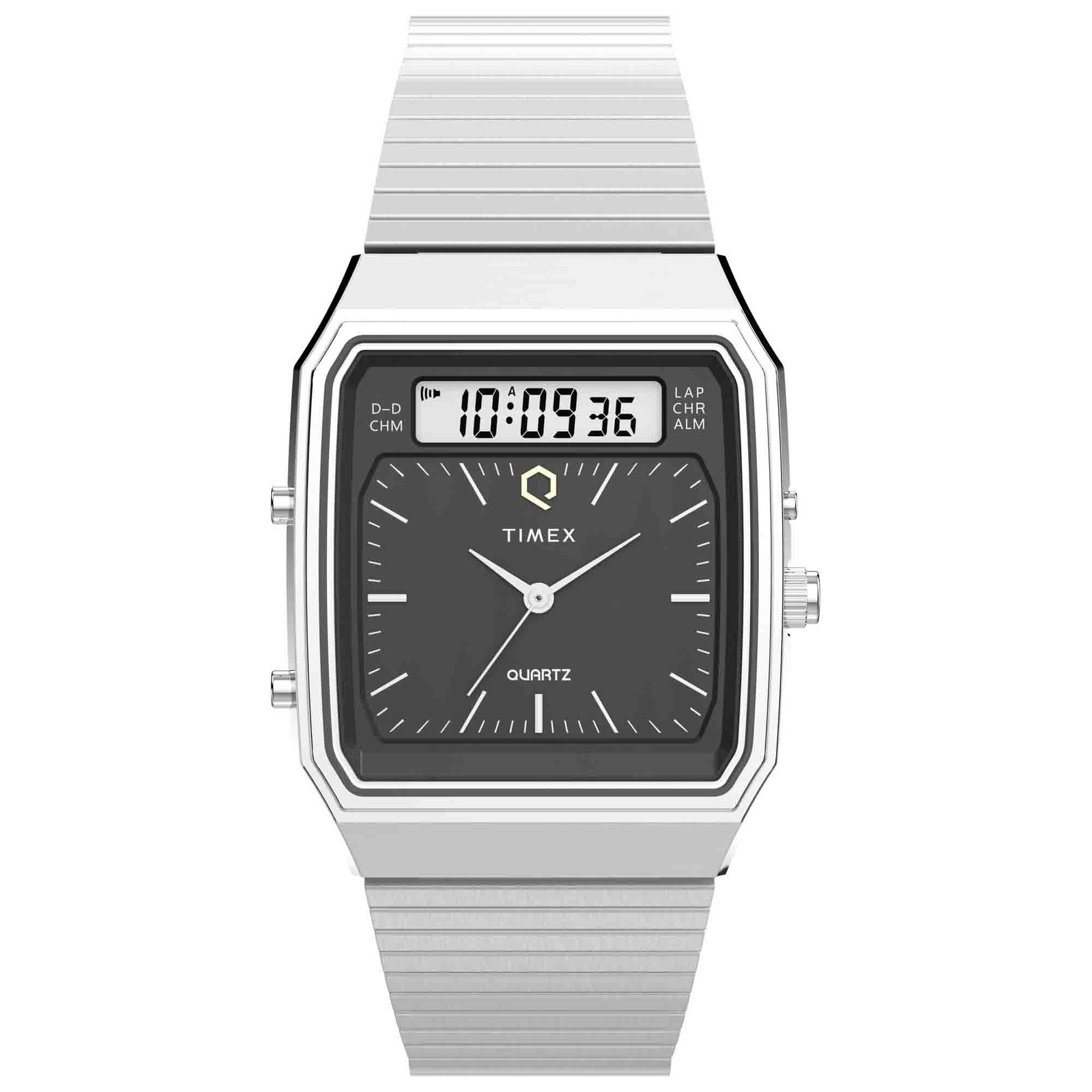 A Dynamic Fusion of Tradition and Innovation. This modern-day reissue of an ’80s classic delivers quartz accuracy with a dual analog and digital display on a clean black dial. Upgraded with a modestly sized 33mm brushed and polished stainless-steel case. it’s packed with the features you need to keep you on schedule and get you through the work week: dual time zone tracking. a chronograph. alarm. and date function. Finished with a thin handset. a polished crown and pushers. a brushed silver-tone stainless-steel bracelet. and the distinct Q Timex logo authentic to the original. this ana-digi dress watch is a true throwback.