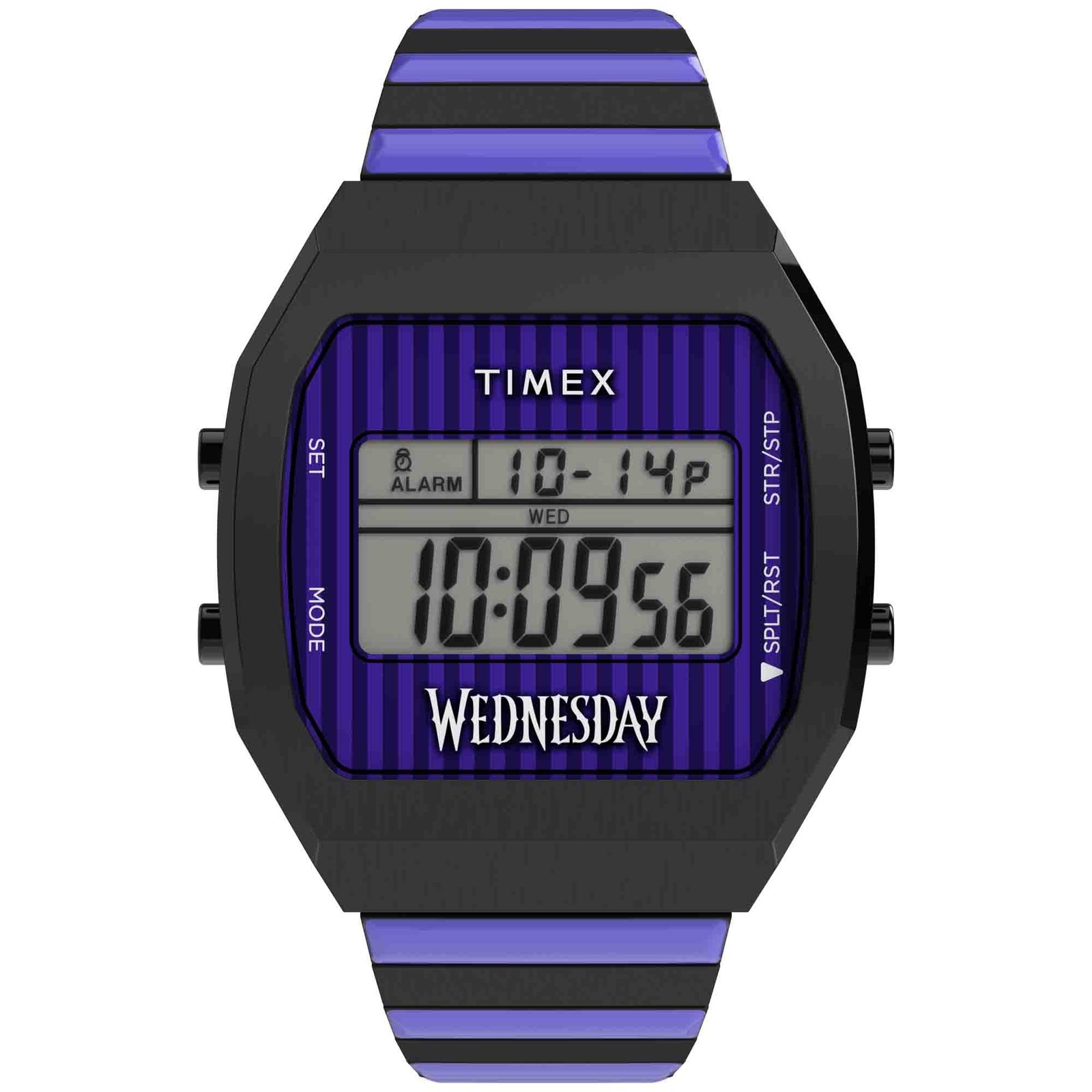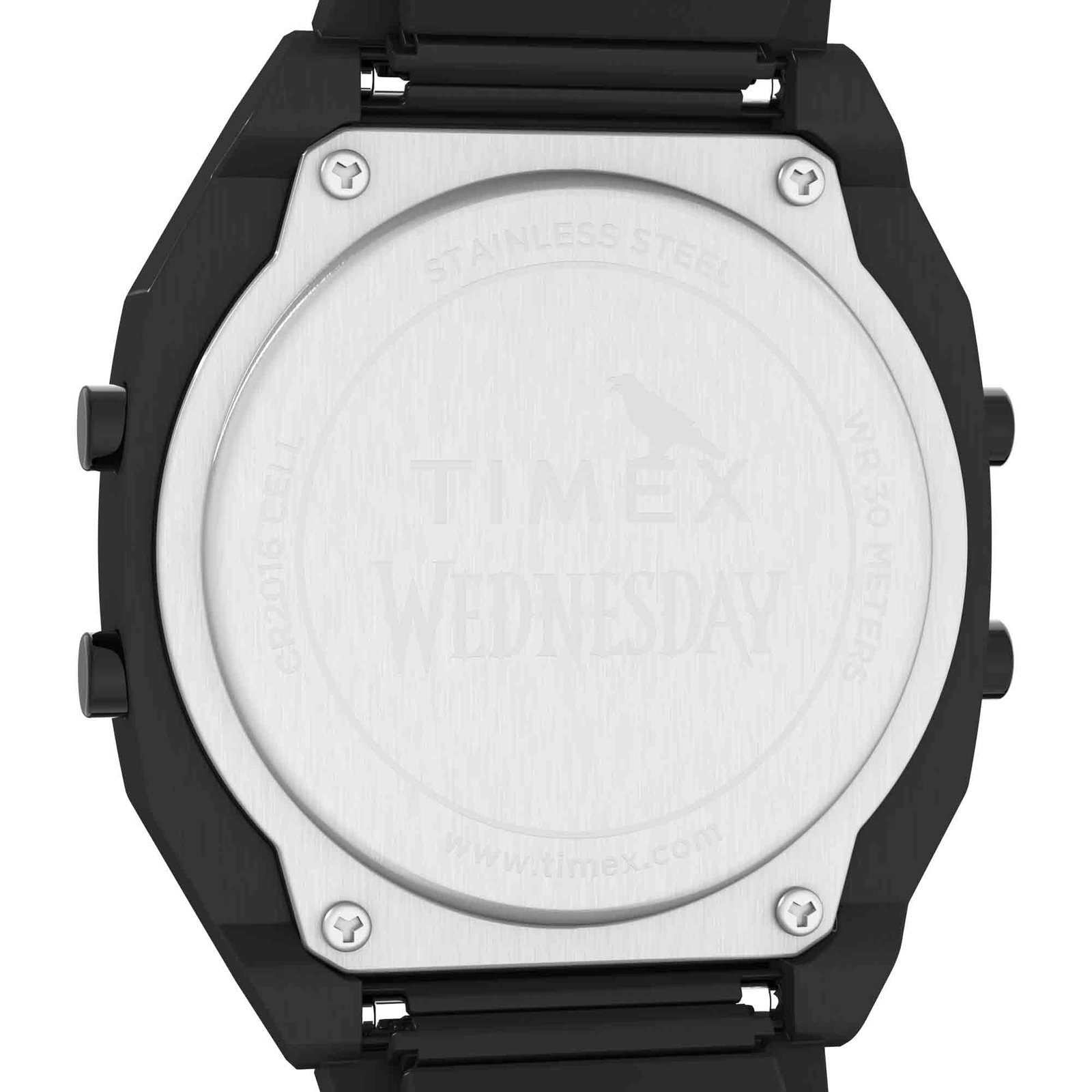 Timex is unveiling a darkly delightful collaboration for those brave enough to embrace the macabre. The Timex x Wednesday T80 is laced with eerie details and a hint of mystery. presenting a 36mm stainless-steel case and bracelet in a fun purple and black colorway. When the INDIGLO backlight is activated. a spider web emerges across the display. making for a watch that’s boldly bizarre. daringly different. and anything but ordinary. Plus. the expansion band features the Perfect Fit technology. requiring no tools to get a custom look and feel.
