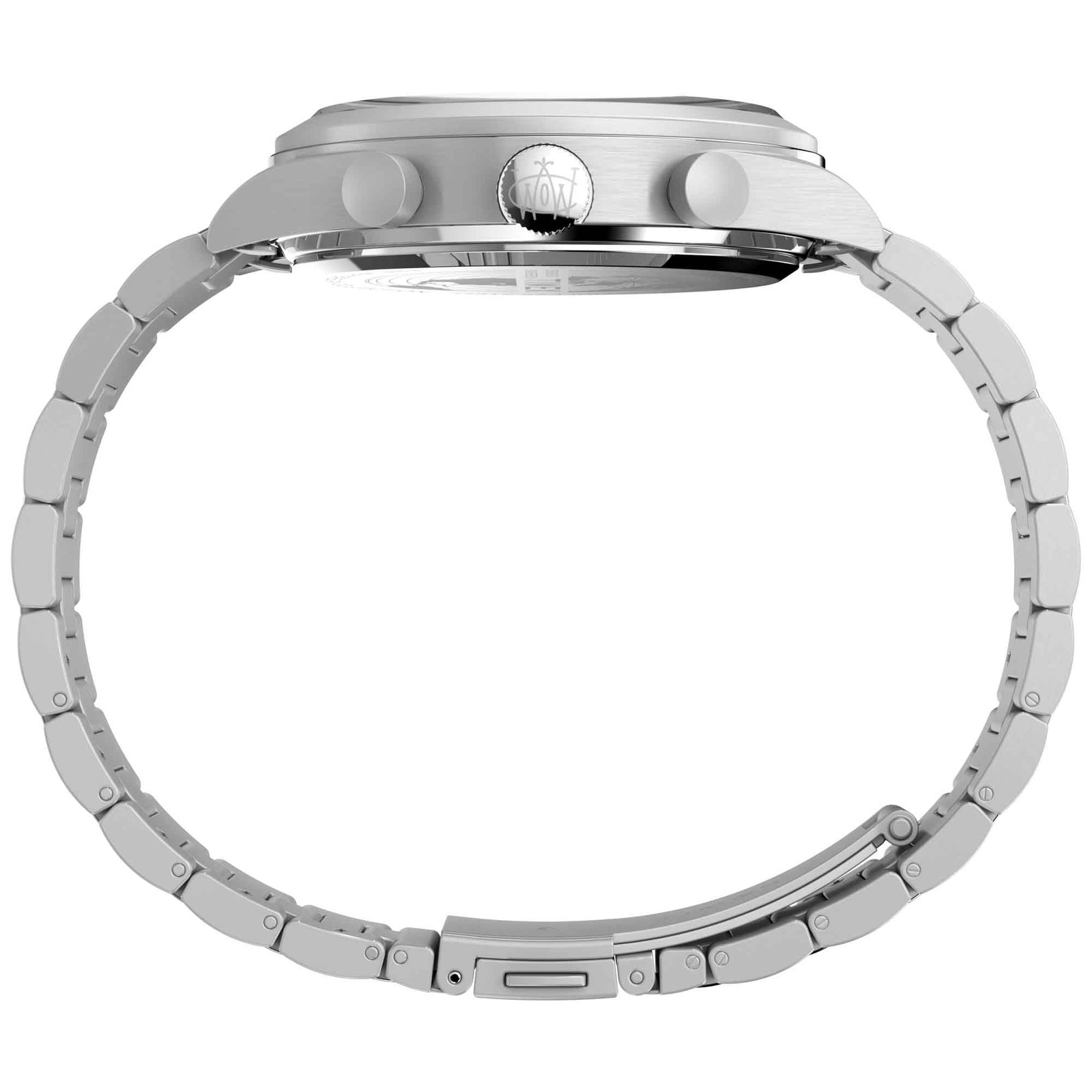 Built with their proprietary fly back chronograph movement designed in Pforzheim. Germany. the dial of the Waterbury Traditional Fly Back Chronograph houses fan-shaped sub-dials at the 4 o’clock and 10 o’clock positions with retrograde hands. A single press of the fly back pusher instantly resets the chronograph to display the current time in the current lap without the need to stop and reset. and when the chronograph isn’t in use. the upper sub-dial doubles as a second time zone indicator. This watch boasts a robust 43mm stainless-steel case paired with an adjustable stainless-steel bracelet. Other notable details include a date window positioned at 2:30. luminous hour and minute hands for enhanced visibility. 100m of water resistance. and the iconic stylized W of the Waterbury Watch Company logo displayed on the crown. sweep second hand. and beside the 7th hour marker.