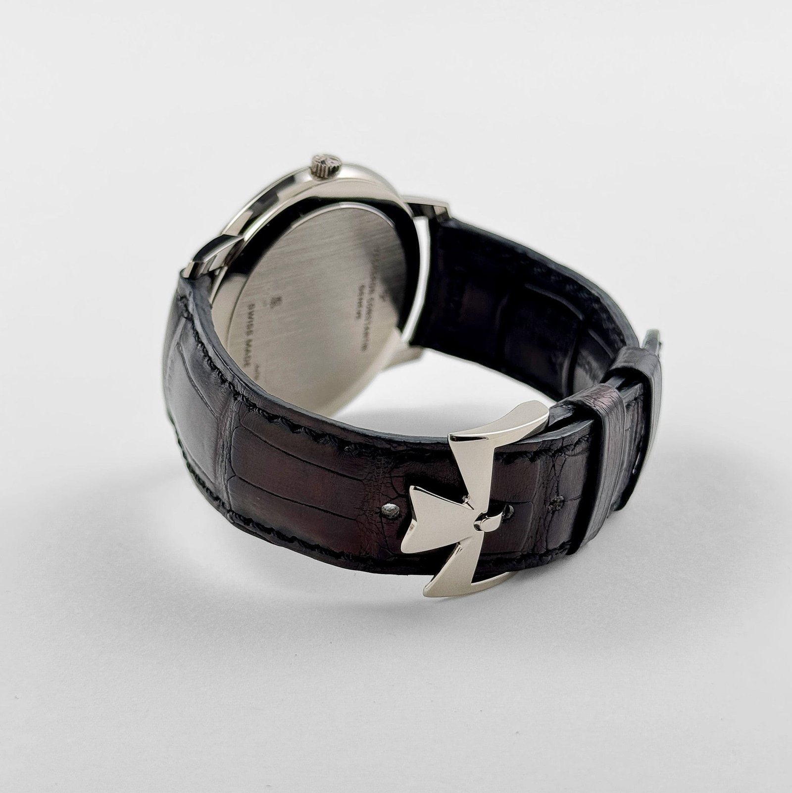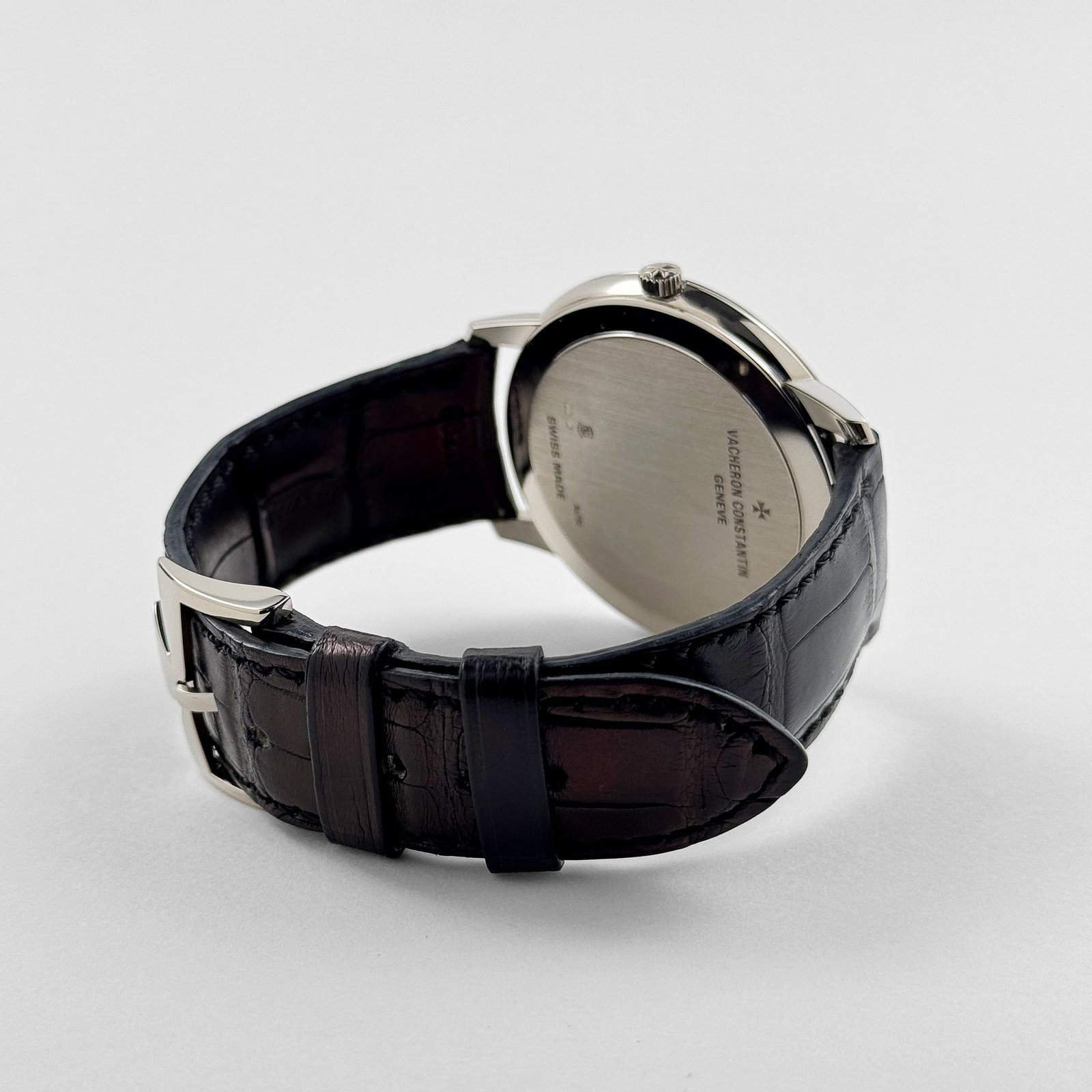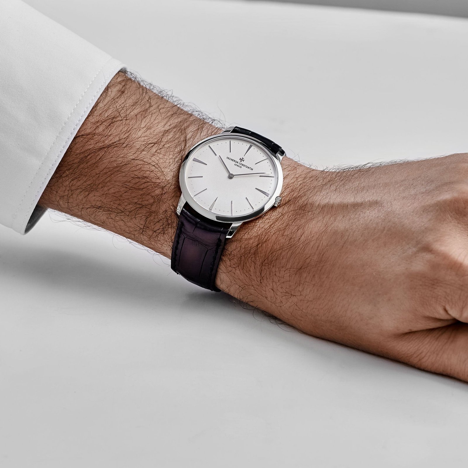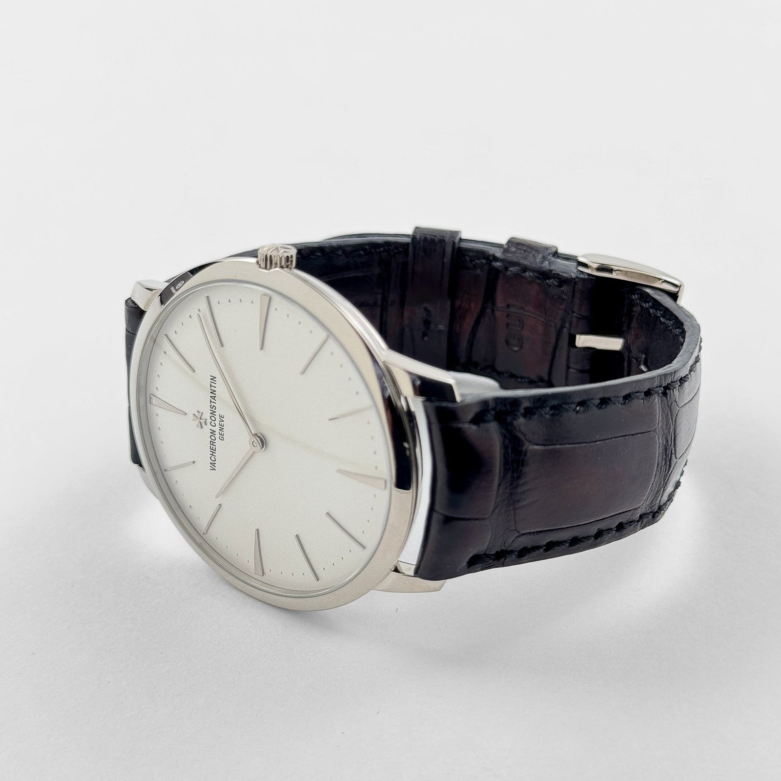 The Vacheron Constantin Patrimony 81180/000G-9117 embodies ultra-thin elegance and minimalist heritage in a refined 40 mm white gold case. just 6.7 mm thick. Its opaline silver dial features slender white-gold baton hour markers and matching hands. all tracing a subtly domed profile. The slim bezel and clean facets envelop the dial with an arrondissement of understated class. while a black alligator strap with white-gold tang buckle completes the refined. dressy aesthetic.