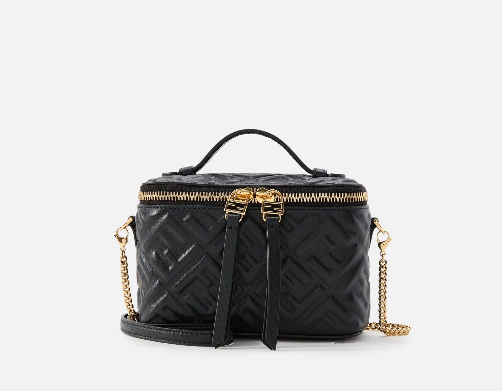 The Fendi Vanity Bag features an iconic FF jacquard finish. while a double-slider zipper. gold hardware and a detachable strap enhance its luxury construction.