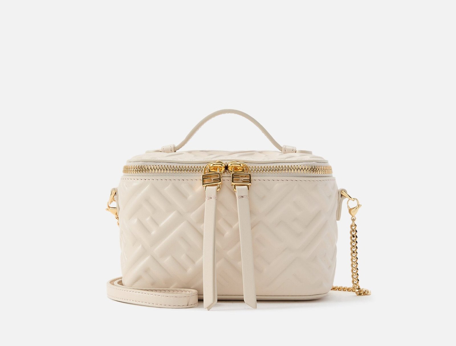 The Fendi Vanity Bag features an iconic FF jacquard finish. while a double-slider zipper. gold hardware and a detachable strap enhance its luxury construction.