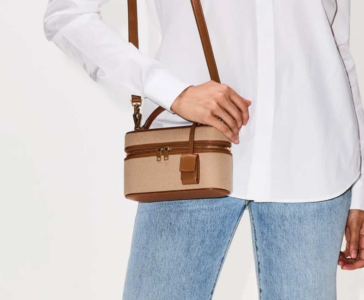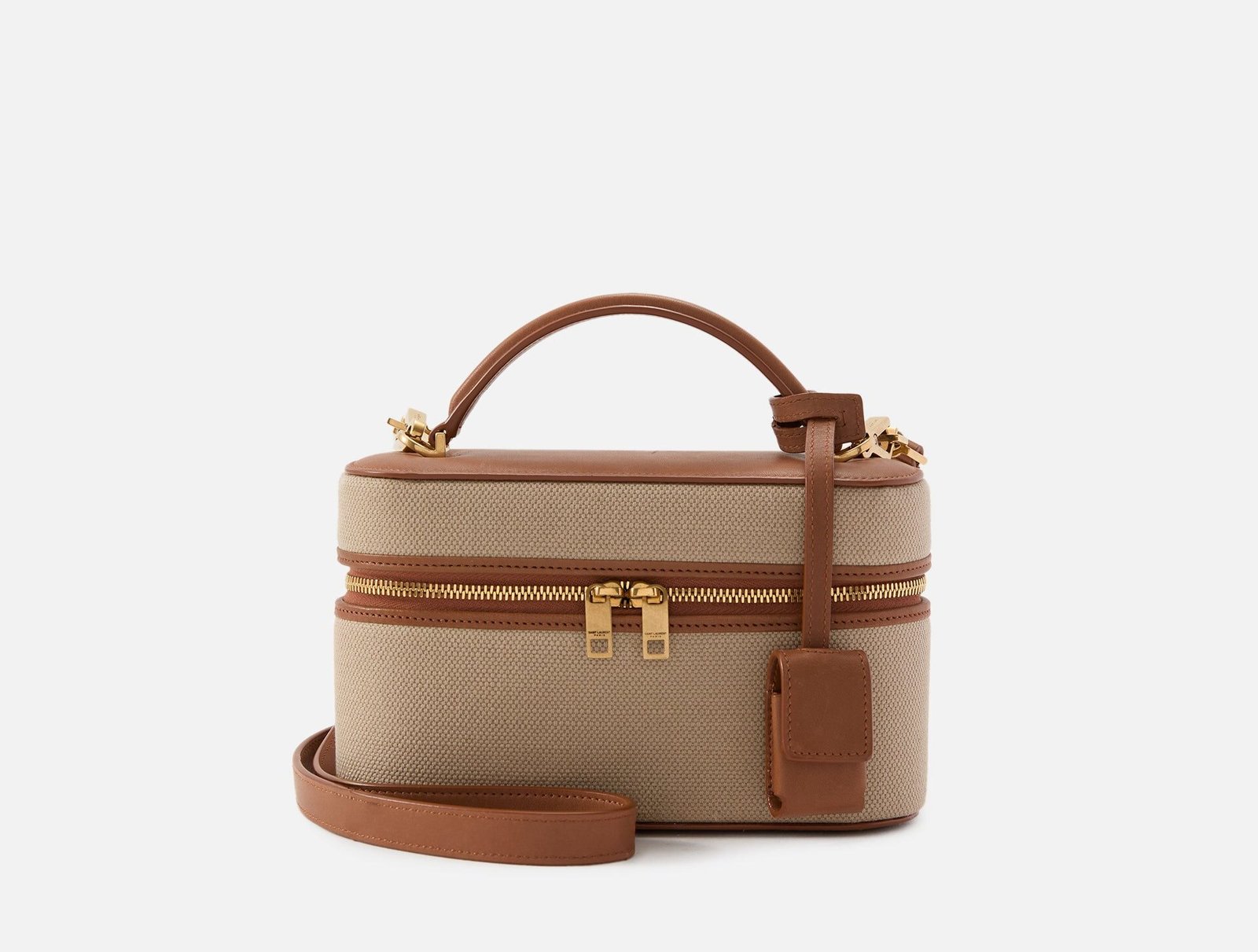 This Vanity Bag. trimmed in leather. is a luxurious ode to classic elegance. Its canvas finish and YSL Cassandre logo make it a timeless piece. carrying your essentials with a sophistication that elevates any moment.
